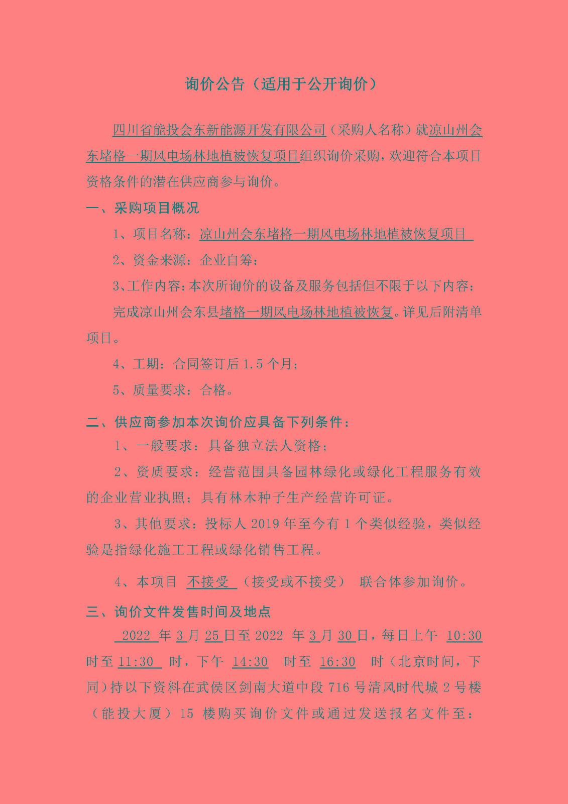 四川省能投会东新能源开发有限公司(采购人名称)就凉山州会东堵格一期风电场林地植被恢复项目组织询价采购,欢迎符合本项目资格条件的潜在供应商参与询价。