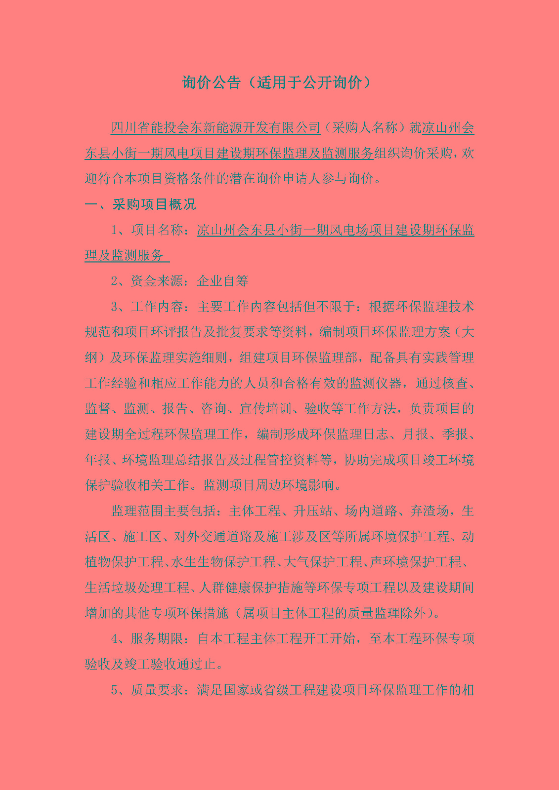 四川省能投会东新能源开发有限公司(采购人名称)就凉山州会东县小街一期风电项目建设期环保监理及监测服务组织询价采购,欢迎符合本项目资格条件的潜在询价申请人参与询价。