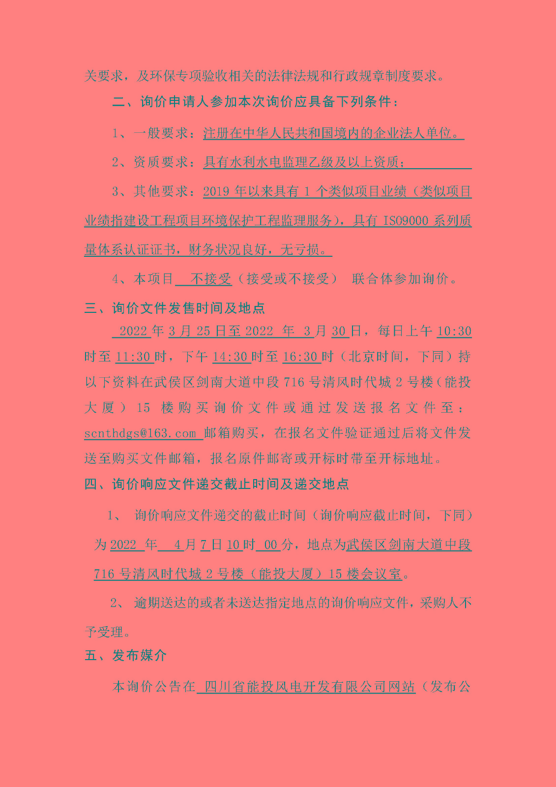 2022年3月25日至2022 年 3月30日,每日上午10:30时至11:30时,下午14:30时至16:30时(北京时间,下同)持以下资料在武侯区剑南大道中段716号清风时代城2号楼(能投大厦)15楼购买询价文件或通过发送报名文件至:[email protected]邮箱购买,在报名文件验证通过后将文件发送至购买文件邮箱,报名原件邮寄或开标时带至开标地址。