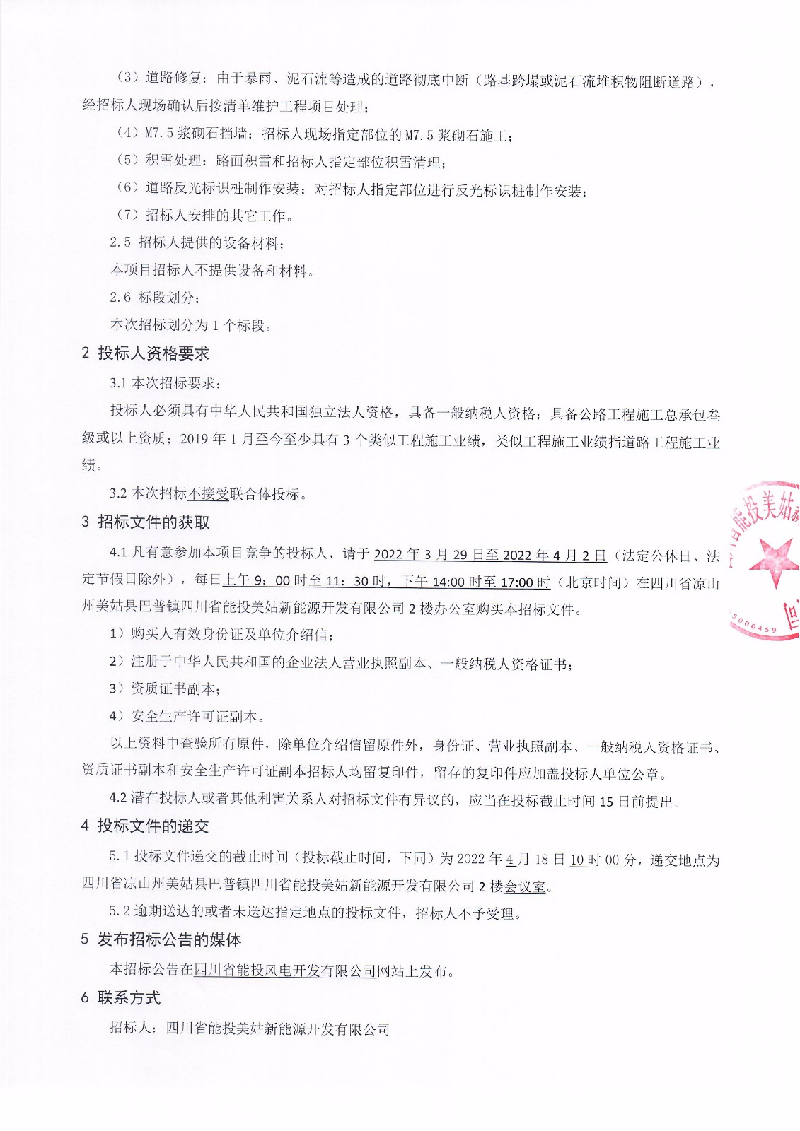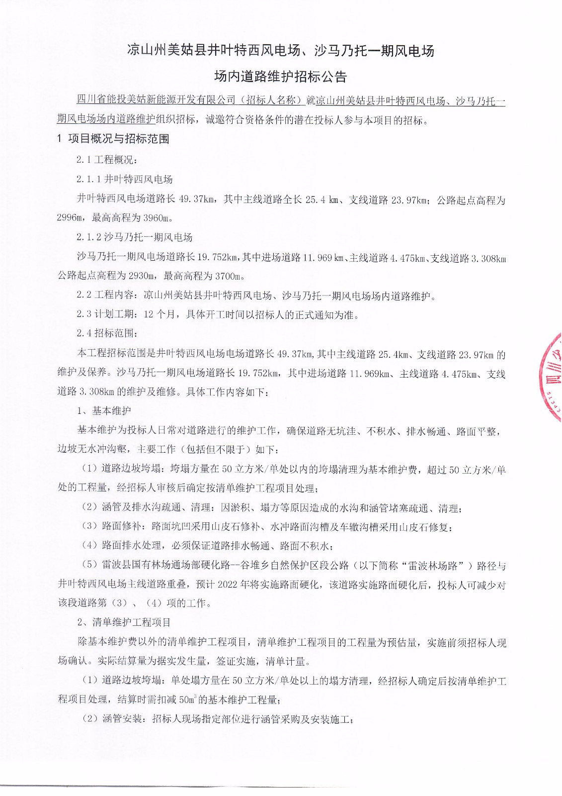 四川省能投美姑新能源开发有限公司(招标人名称)就凉山州美姑县井叶特西风电场、沙马乃托一期风电场场内道路维护组织招标,诚邀符合资格条件的潜在投标人参与本项目的招标。