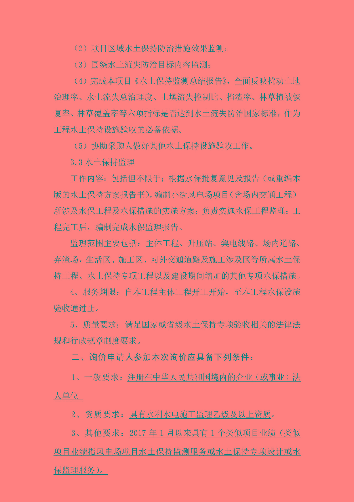 工作内容:包括但不限于:根据水保批复意见及报告(或重编本版的水土保持方案报告书),编制小街风电场项目(含场内交通工程)所涉及水保工程及水保措施的实施方案;负责实施水保工程监理;工程完工后,编制完成水保监理报告。