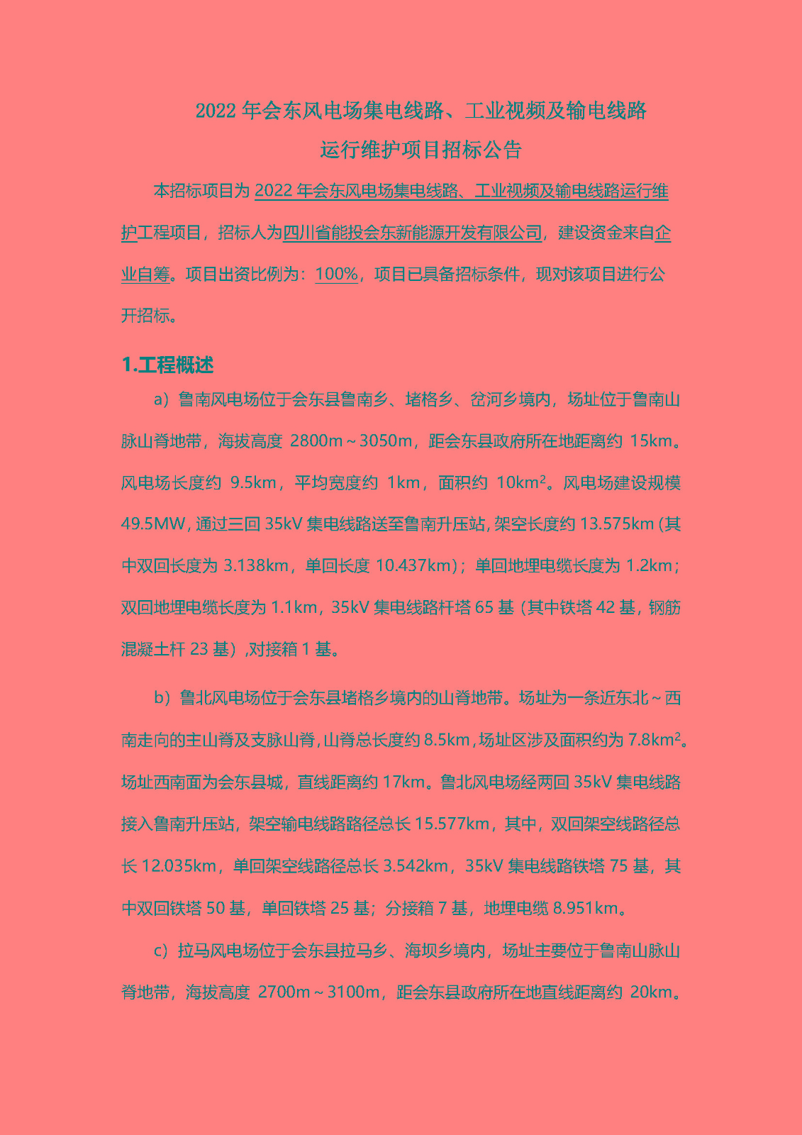本招标项目为2022年会东风电场集电线路、工业视频及输电线路运行维护工程项目,招标人为四川省能投会东新能源开发有限公司,建设资金来自企业自筹。项目出资比例为:100%,项目已具备招标条件,现对该项目进行公开招标。