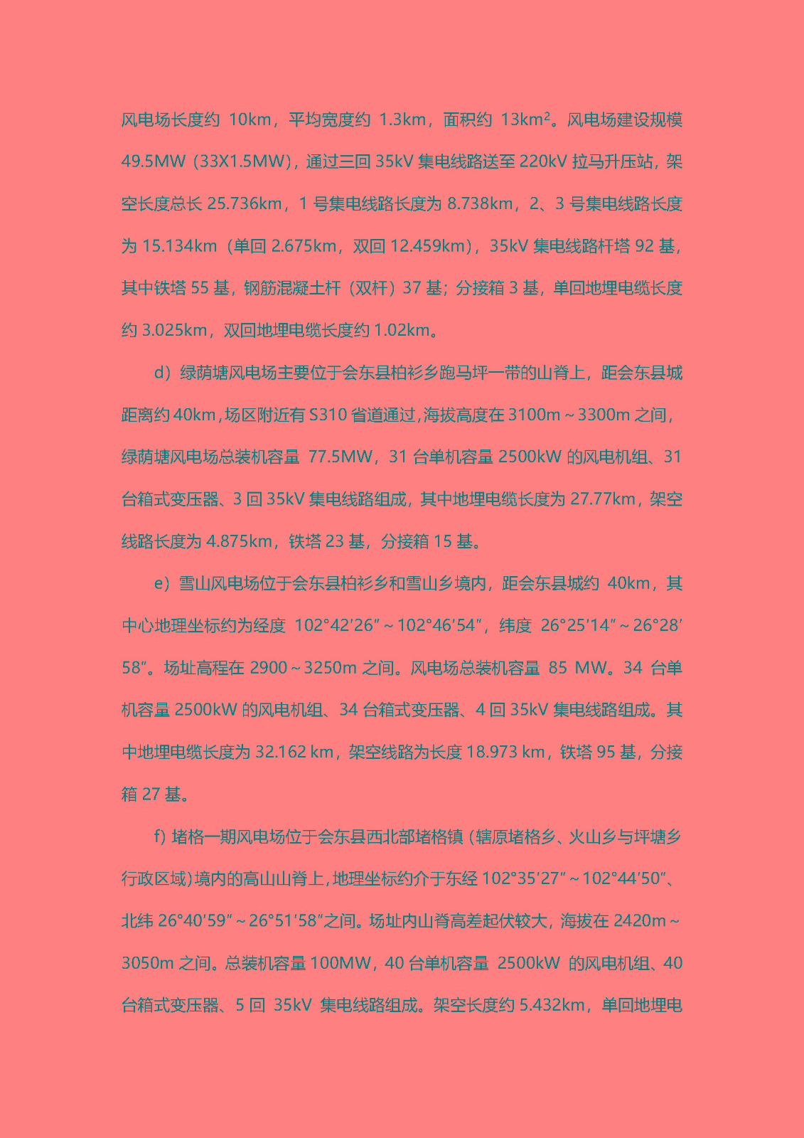 e)雪山风电场位于会东县柏衫乡和雪山乡境内,距会东县城约 40km,其中心地理坐标约为经度 102°42′26″~102°46′54″,纬度 26°25′14″~26°28′58″。场址高程在2900~3250m之间。风电场总装机容量 85 MW。34 台单机容量2500kW的风电机组、34台箱式变压器、4回35kV集电线路组成。其中地埋电缆长度为32.162 km,架空线路为长度18.973 km,铁塔95基,分接箱27基。