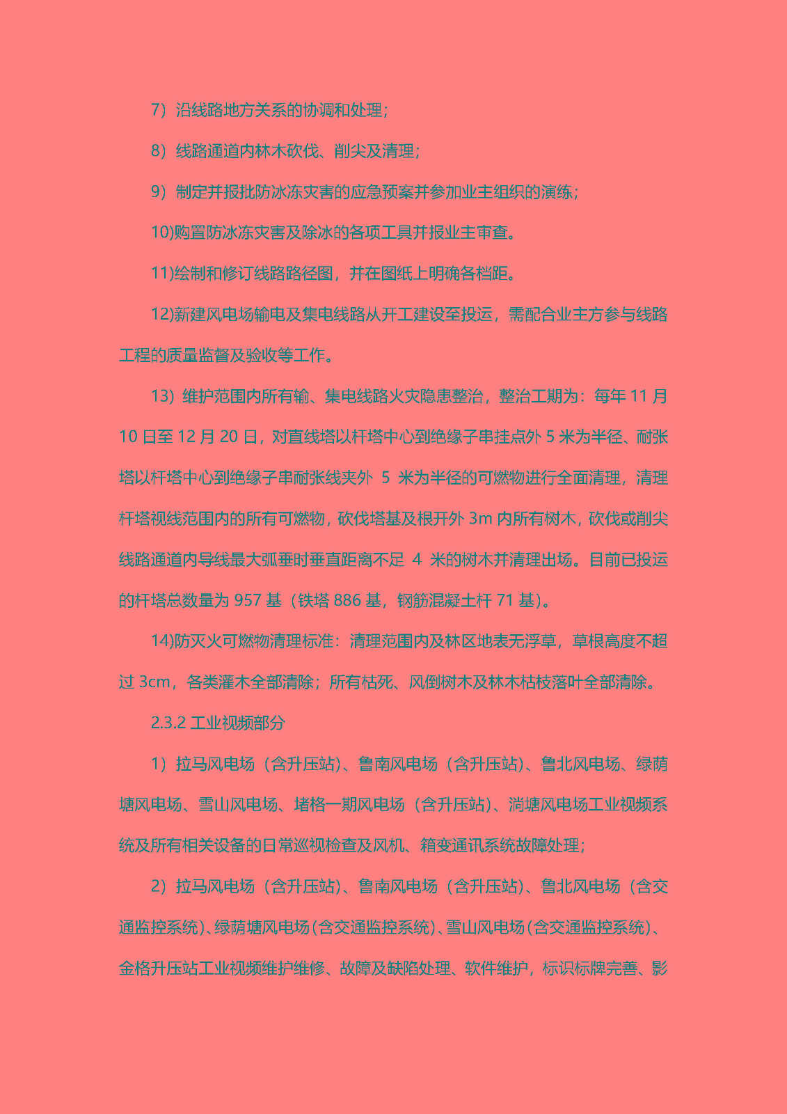 1)拉马风电场(含升压站)、鲁南风电场(含升压站)、鲁北风电场、绿荫塘风电场、雪山风电场、堵格一期风电场(含升压站)、淌塘风电场工业视频系统及所有相关设备的日常巡视检查及风机、箱变通讯系统故障处理;