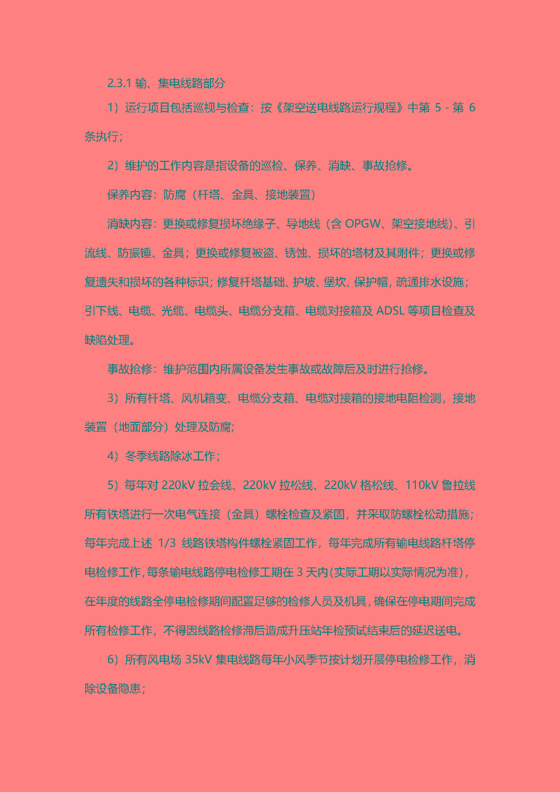 12)新建风电场输电及集电线路从开工建设至投运,需配合业主方参与线路工程的质量监督及验收等工作。