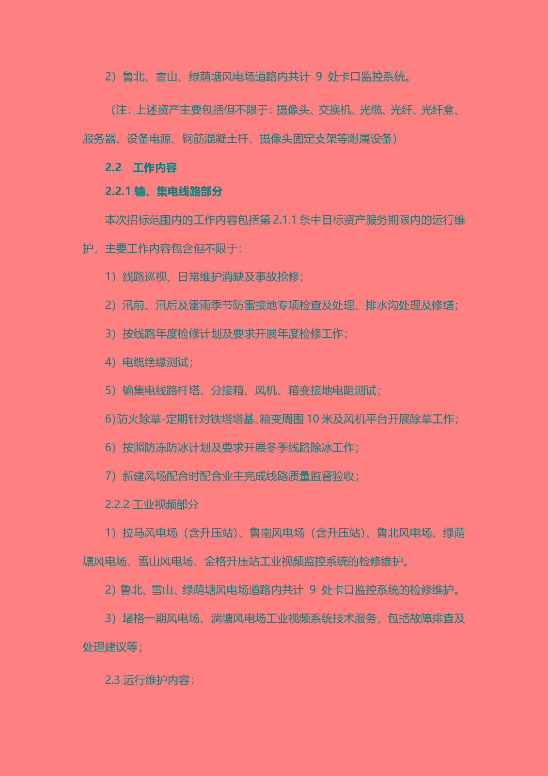 1)拉马风电场(含升压站)、鲁南风电场(含升压站)、鲁北风电场、绿荫塘风电场、雪山风电场、金格升压站工业视频监控系统的检修维护。