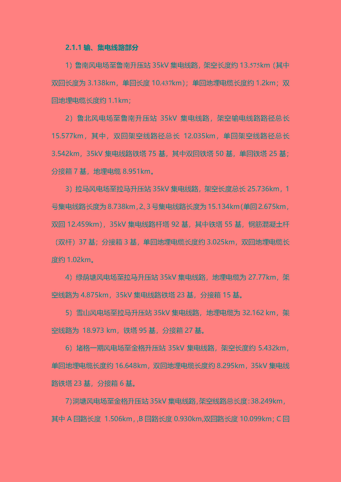 3)拉马风电场至拉马升压站35kV集电线路,架空长度总长25.736km,1号集电线路长度为8.738km,2、3号集电线路长度为15.134km(单回2.675km,双回12.459km),35kV集电线路杆塔92基,其中铁塔55基,钢筋混凝土杆(双杆)37基;分接箱3基,单回地埋电缆长度约3.025km,双回地埋电缆长度约1.02km。