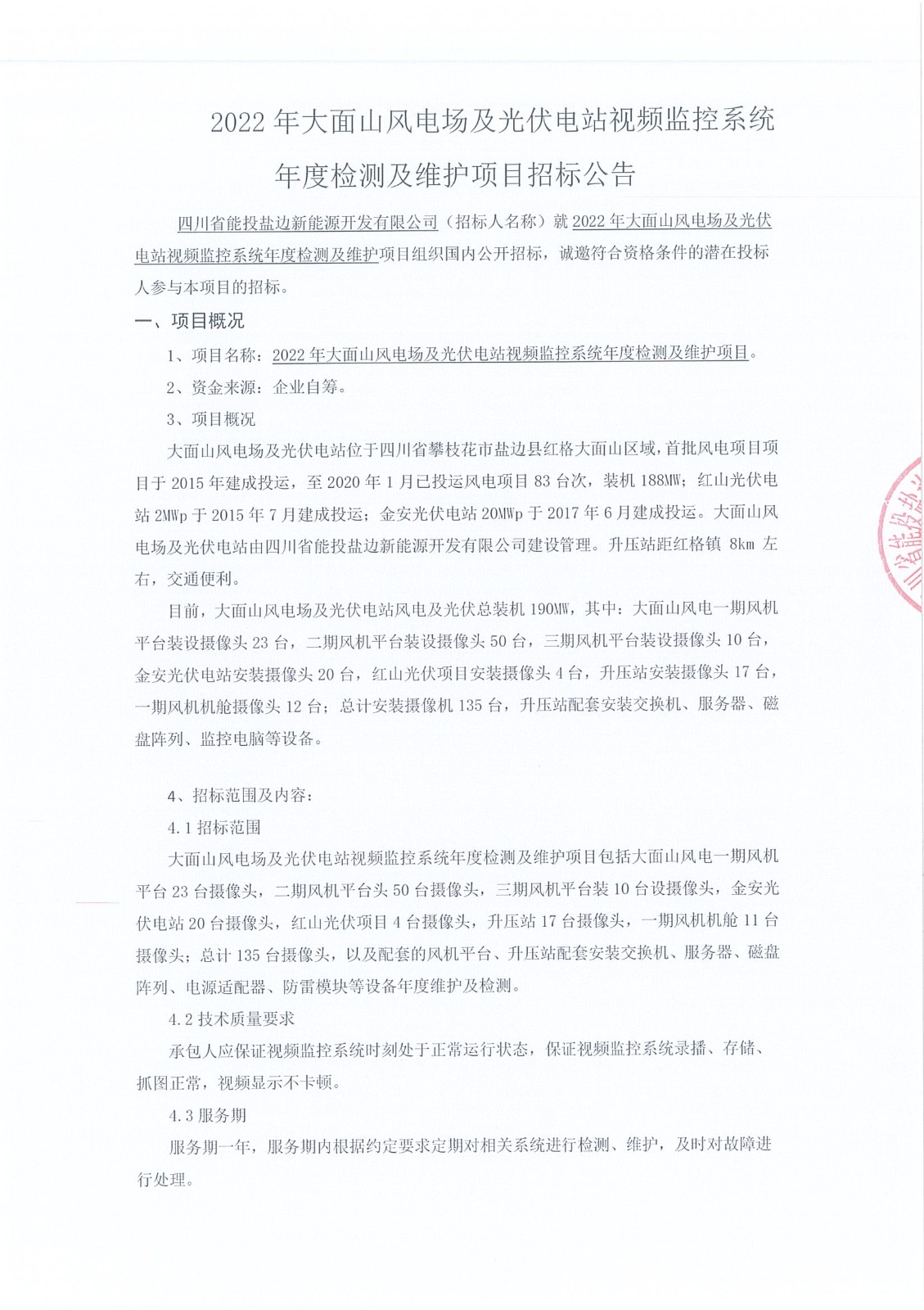 四川省能投盐边新能源开发有限公司(招标人名称)就2022年大面山风电场及光伏电站视频监控系统年度检测及维护项目组织国内公开招标,诚邀符合资格条件的潜在投标人参与本项目的招标。
