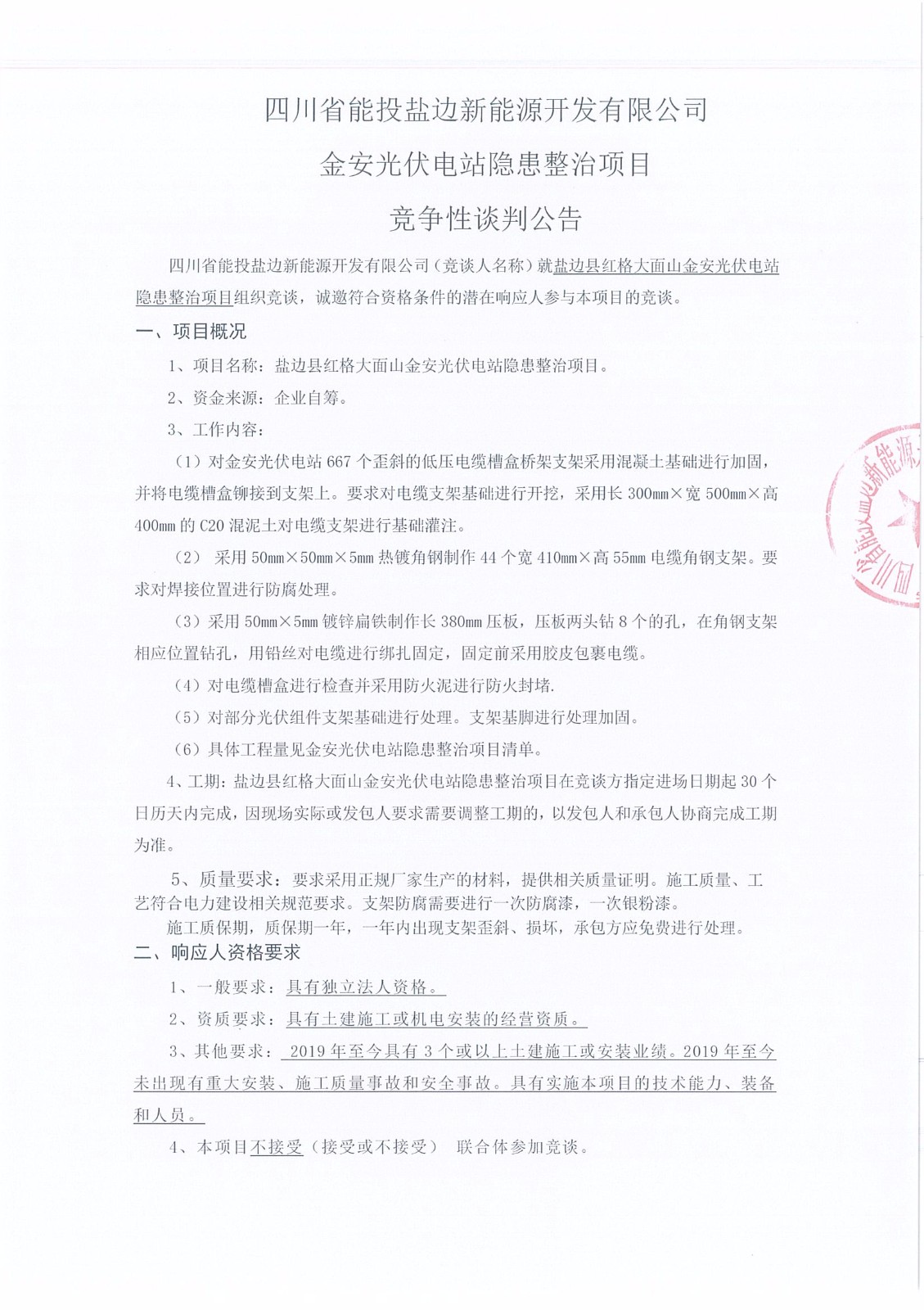 四川省能投盐边新能源开发有限公司(竞谈人名称)就盐边县红格大面山金安光伏电站隐患整治项目组织竞谈,诚邀符合资格条件的潜在响应人参与本项目的竞谈。