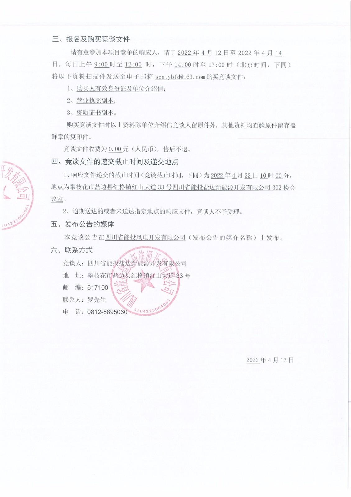 1、响应文件递交的截止时间(竞谈截止时间,下同)为2022年4月22日10时00分,地点为攀枝花市盐边县红格镇红山大道33号四川省能投盐边新能源开发有限公司302楼会议室。