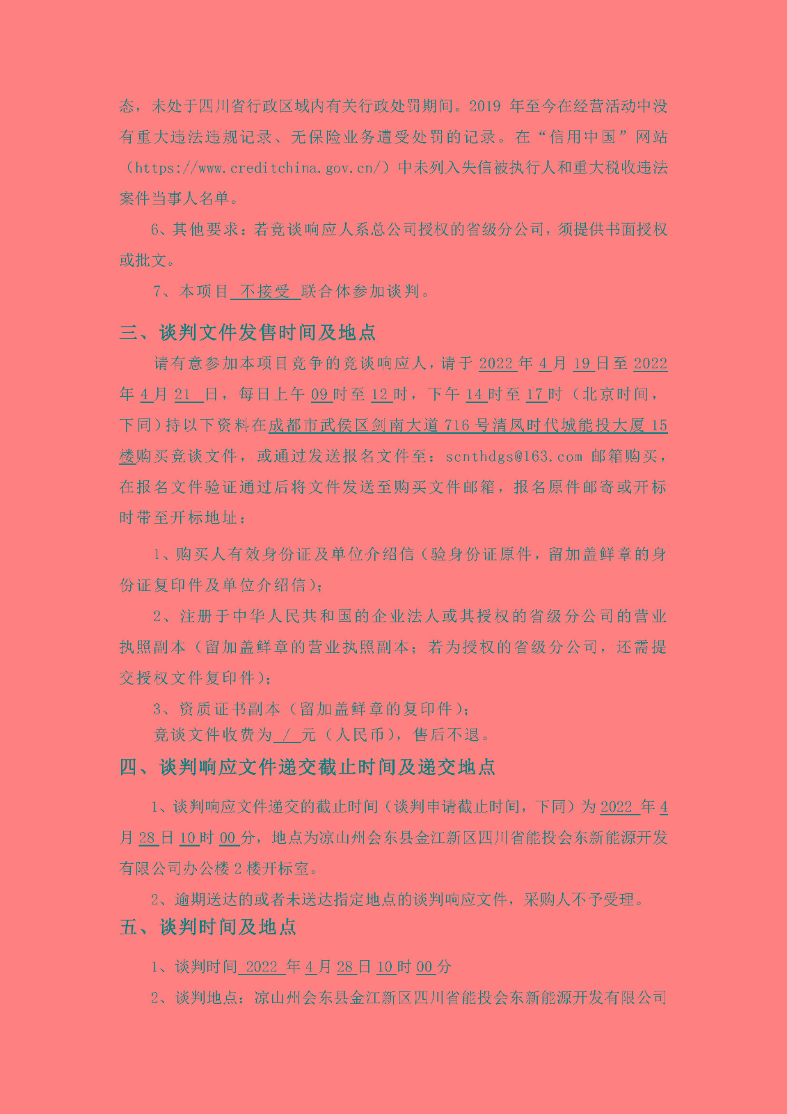 2、谈判地点:凉山州会东县金江新区四川省能投会东新能源开发有限公司办公楼2楼开标室。