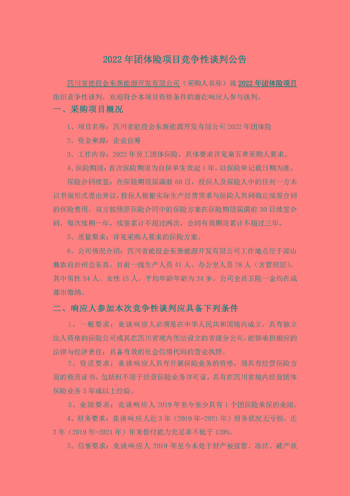 四川省能投会东新能源开发有限公司(采购人名称)就2022年团体险项目组织竞争性谈判,欢迎符合本项目资格条件的潜在响应人参与谈判。