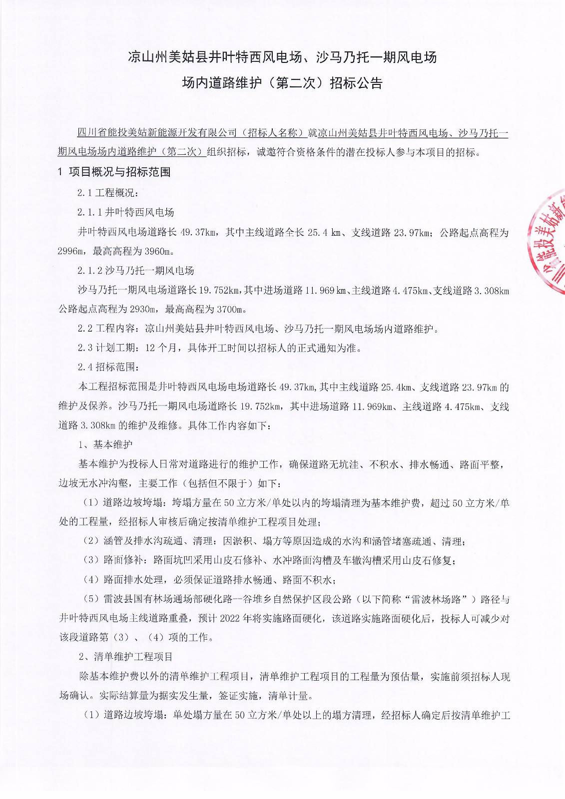 四川省能投美姑新能源开发有限公司(招标人名称)就凉山州美姑县井叶特西风电场、沙马乃托一期风电场场内道路维护(第二次)组织招标,诚邀符合资格条件的潜在投标人参与本项目的招标。