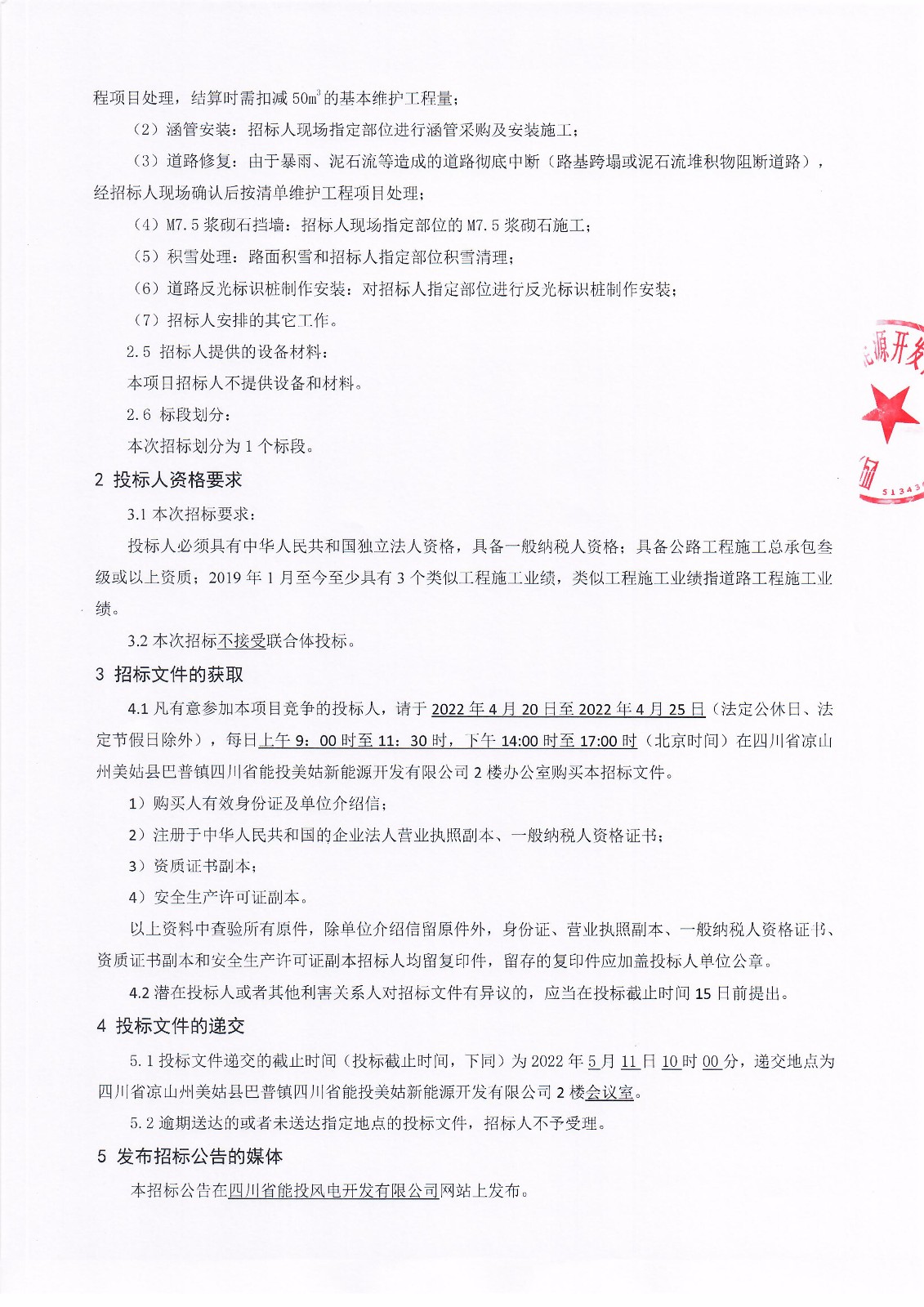 5.1投标文件递交的截止时间(投标截止时间,下同)为2022年5月11日10时00分,递交地点为四川省凉山州美姑县巴普镇四川省能投美姑新能源开发有限公司2楼会议室。