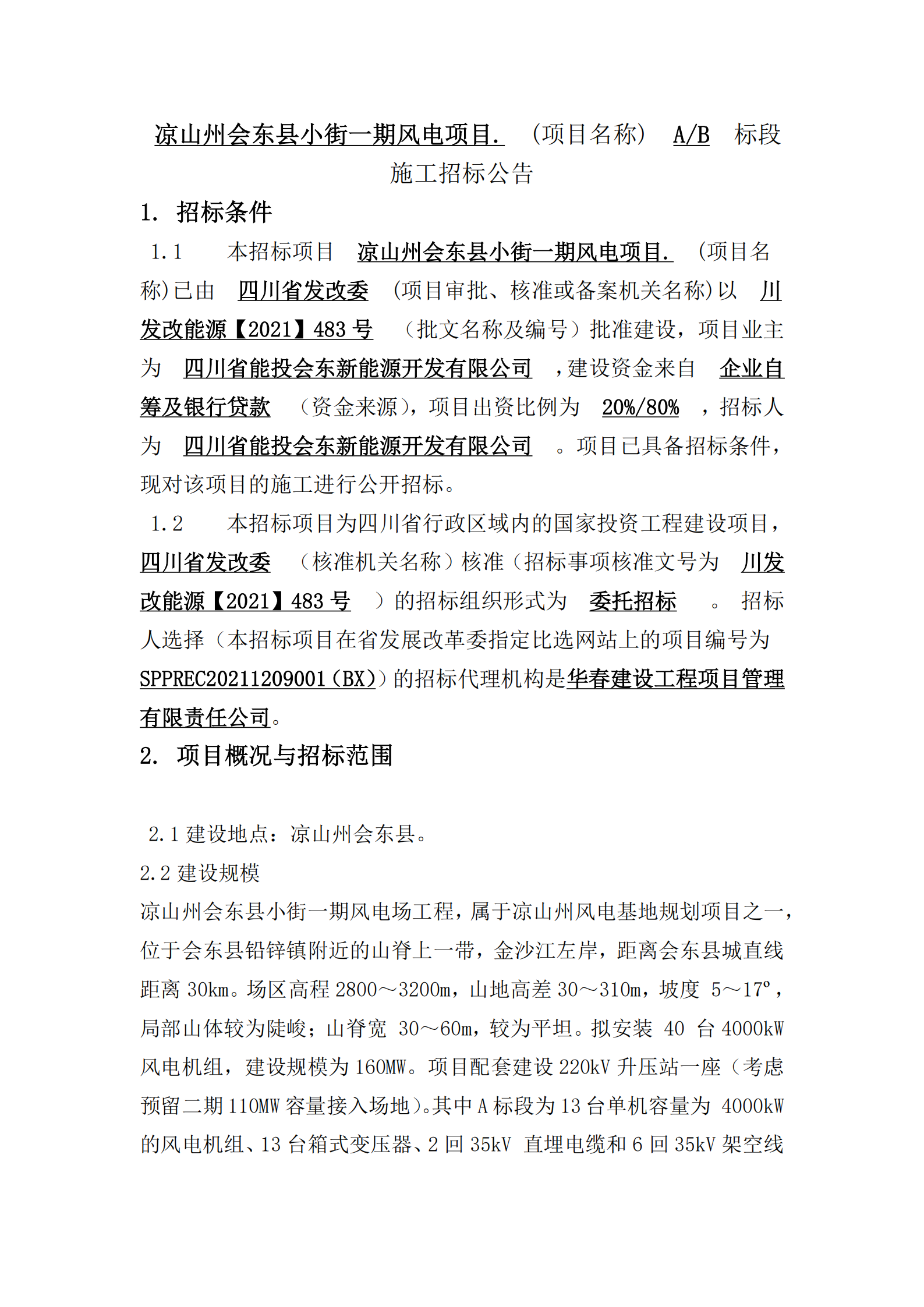 1.1 本招标项目 凉山州会东县小街一期风电项目. (项目名称)已由 四川省发改委 (项目审批、核准或备案机关名称)以 川发改能源【2021】483号 (批文名称及编号)批准建设,项目业主为 四川省能投会东新能源开发有限公司 ,建设资金来自 企业自筹及银行贷款 (资金来源),项目出资比例为 20%/80% ,招标人为 四川省能投会东新能源开发有限公司 。项目已具备招标条件,现对该项目的施工进行公开招标。