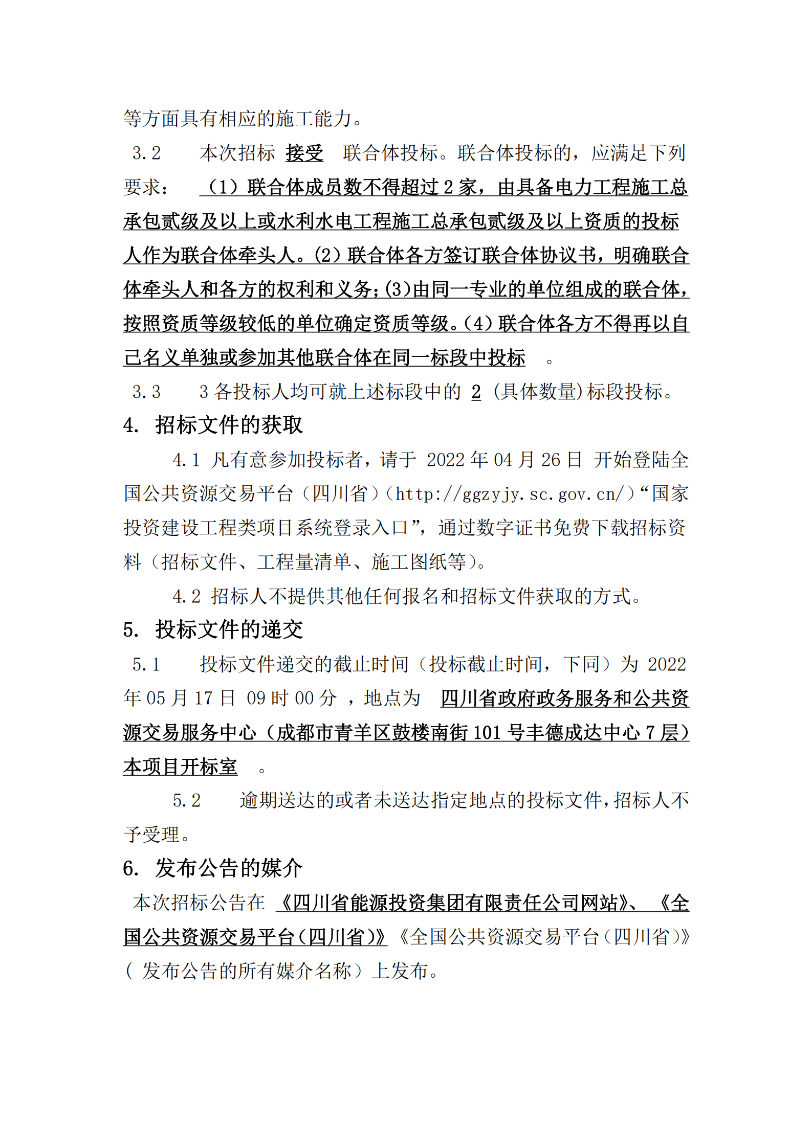 3.2 本次招标 接受 联合体投标。联合体投标的,应满足下列要求: (1)联合体成员数不得超过2家,由具备电力工程施工总承包贰级及以上或水利水电工程施工总承包贰级及以上资质的投标人作为联合体牵头人。(2)联合体各方签订联合体协议书,明确联合体牵头人和各方的权利和义务;(3)由同一专业的单位组成的联合体,按照资质等级较低的单位确定资质等级。(4)联合体各方不得再以自己名义单独或参加其他联合体在同一标段中投标 。