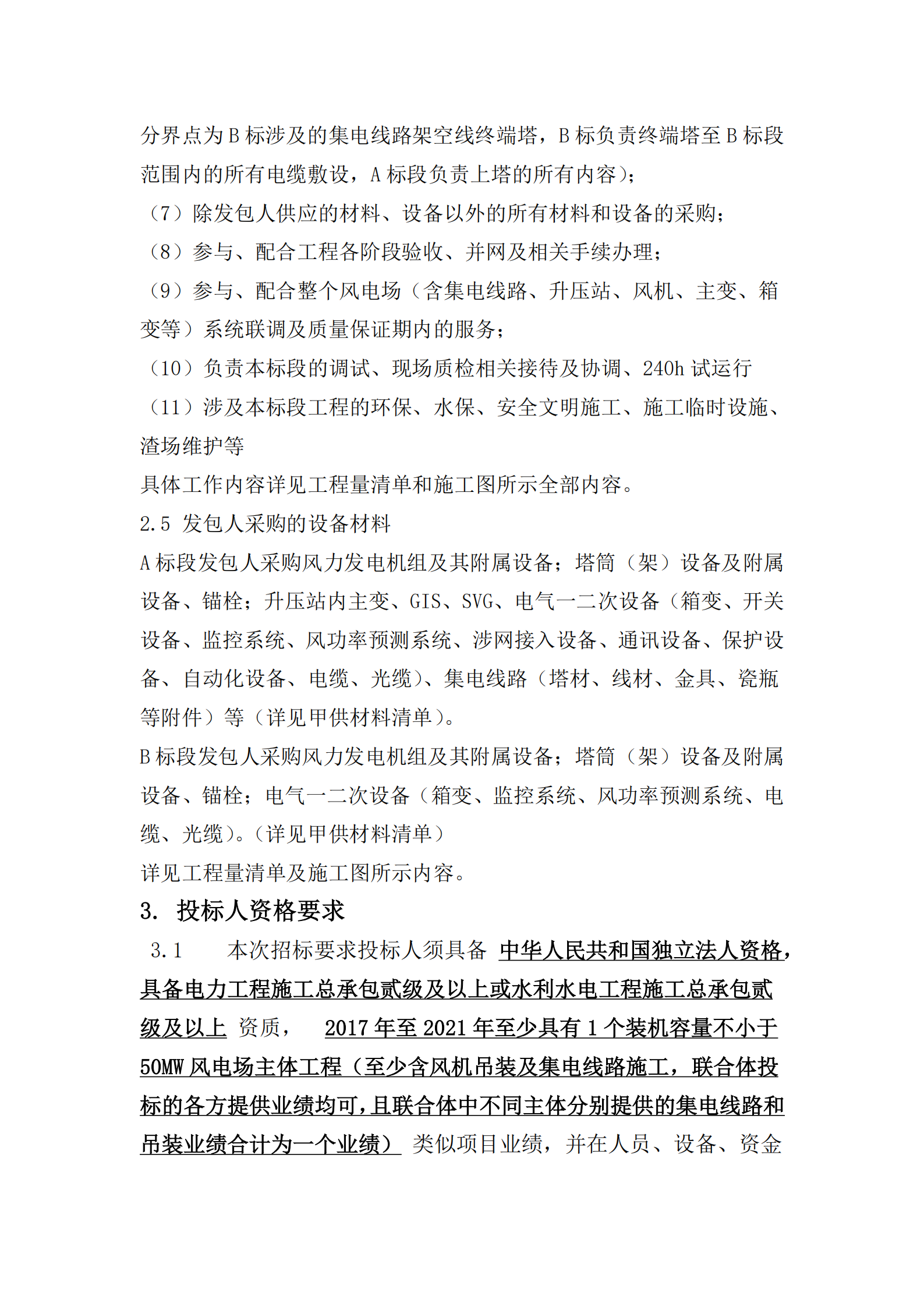 3.1 本次招标要求投标人须具备 中华人民共和国独立法人资格,具备电力工程施工总承包贰级及以上或水利水电工程施工总承包贰级及以上 资质, 2017年至2021年至少具有1个装机容量不小于50MW风电场主体工程(至少含风机吊装及集电线路施工,联合体投标的各方提供业绩均可,且联合体中不同主体分别提供的集电线路和吊装业绩合计为一个业绩) 类似项目业绩,并在人员、设备、资金等方面具有相应的施工能力。