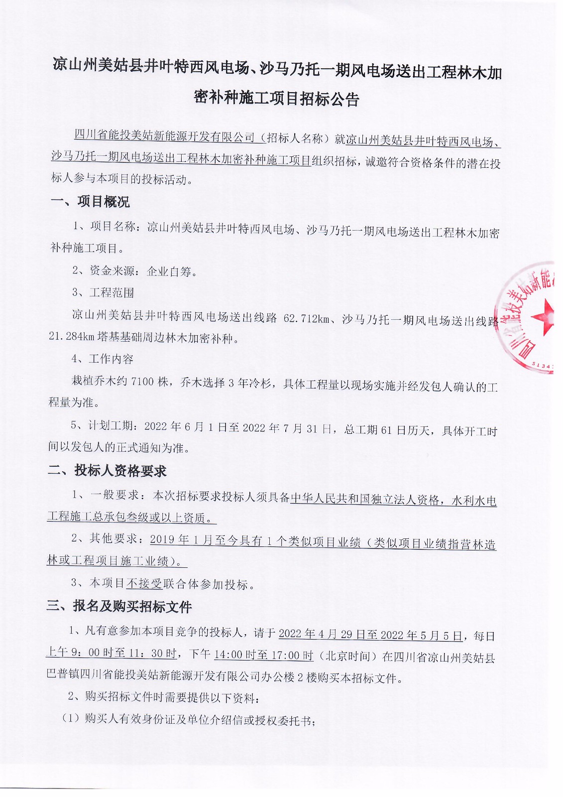 四川省能投美姑新能源开发有限公司(招标人名称)就凉山州美姑县井叶特西风电场、沙马乃托一期风电场送出工程林木加密补种施工项目组织招标,诚邀符合资格条件的潜在投标人参与本项目的投标活动。