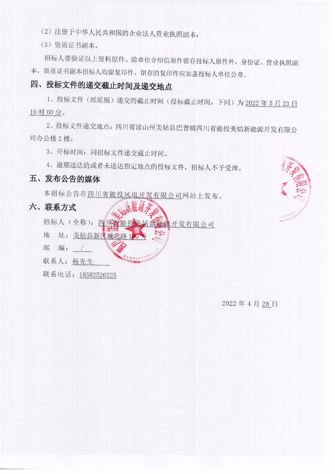 1、凡有意参加本项目竞争的投标人,请于2022年4月29日至2022年5月5日,每日上午9:00时至11:30时,下午14:00时至17:00时(北京时间)在四川省凉山州美姑县巴普镇四川省能投美姑新能源开发有限公司办公楼2楼购买本招标文件。