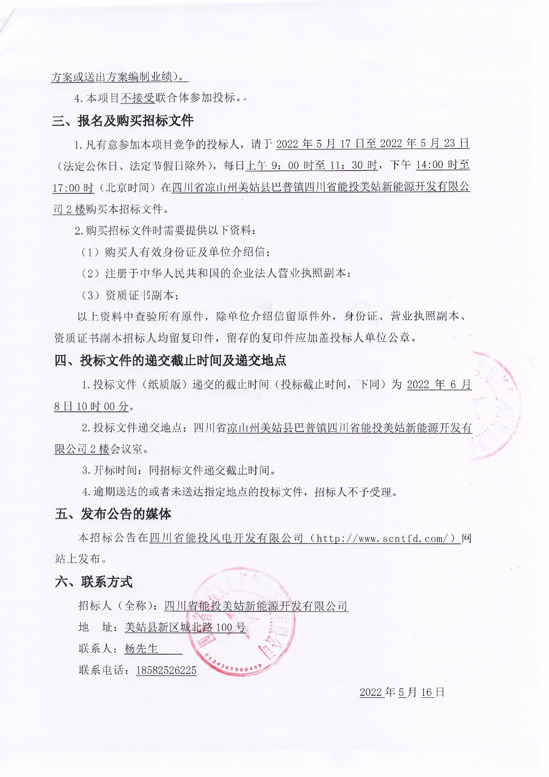 1.凡有意参加本项目竞争的投标人,请于2022年5月17日至2022年5月23日(法定公休日、法定节假日除外),每日上午9:00时至11:30时,下午14:00时至17:00时(北京时间)在四川省凉山州美姑县巴普镇四川省能投美姑新能源开发有限公司2楼购买本招标文件。