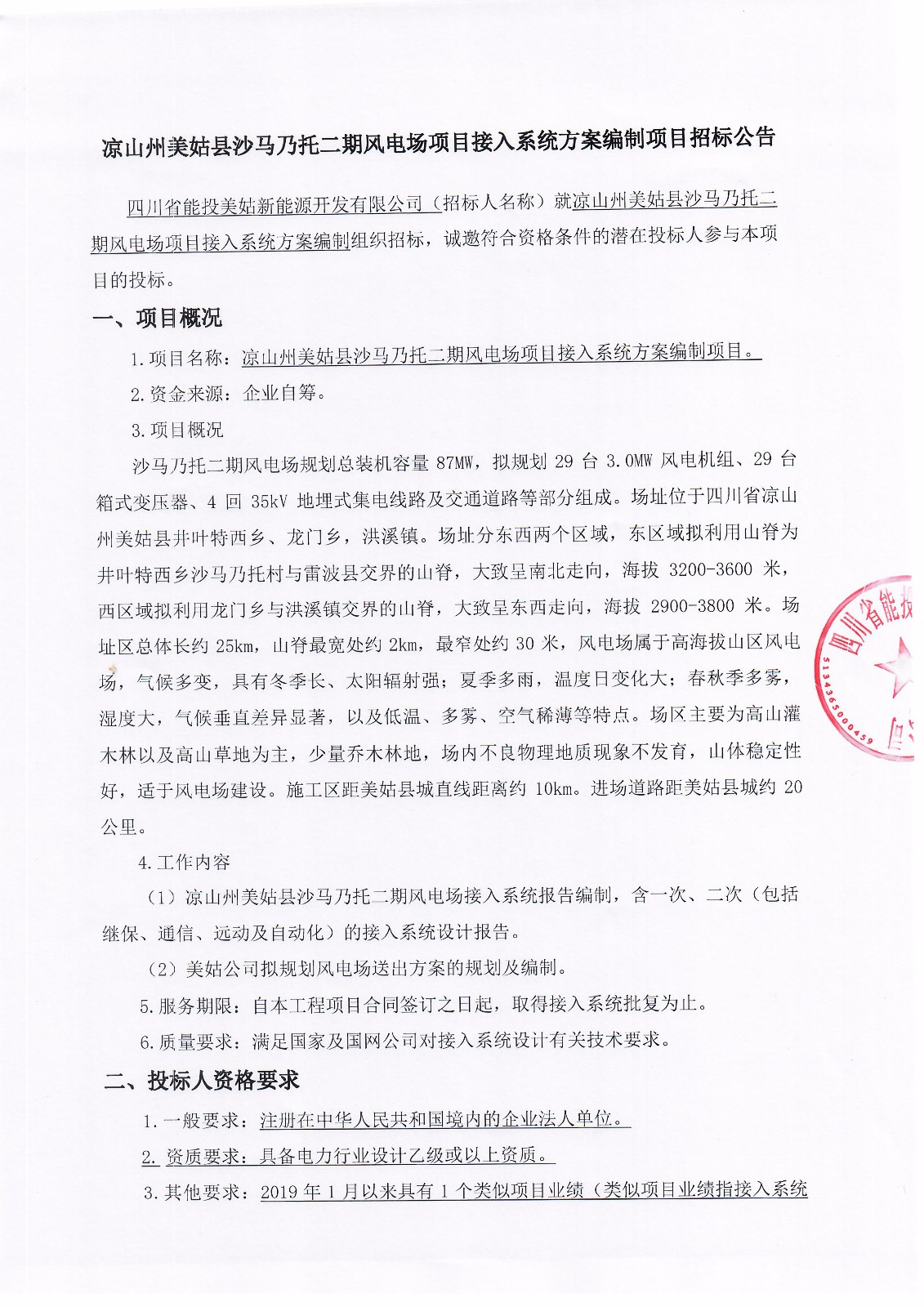 四川省能投美姑新能源开发有限公司(招标人名称)就凉山州美姑县沙马乃托二期风电场项目接入系统方案编制组织招标,诚邀符合资格条件的潜在投标人参与本项目的投标。