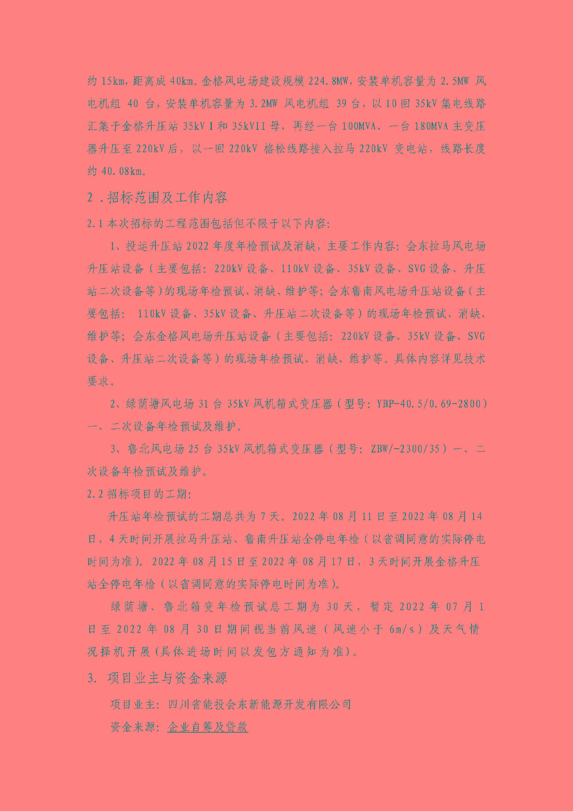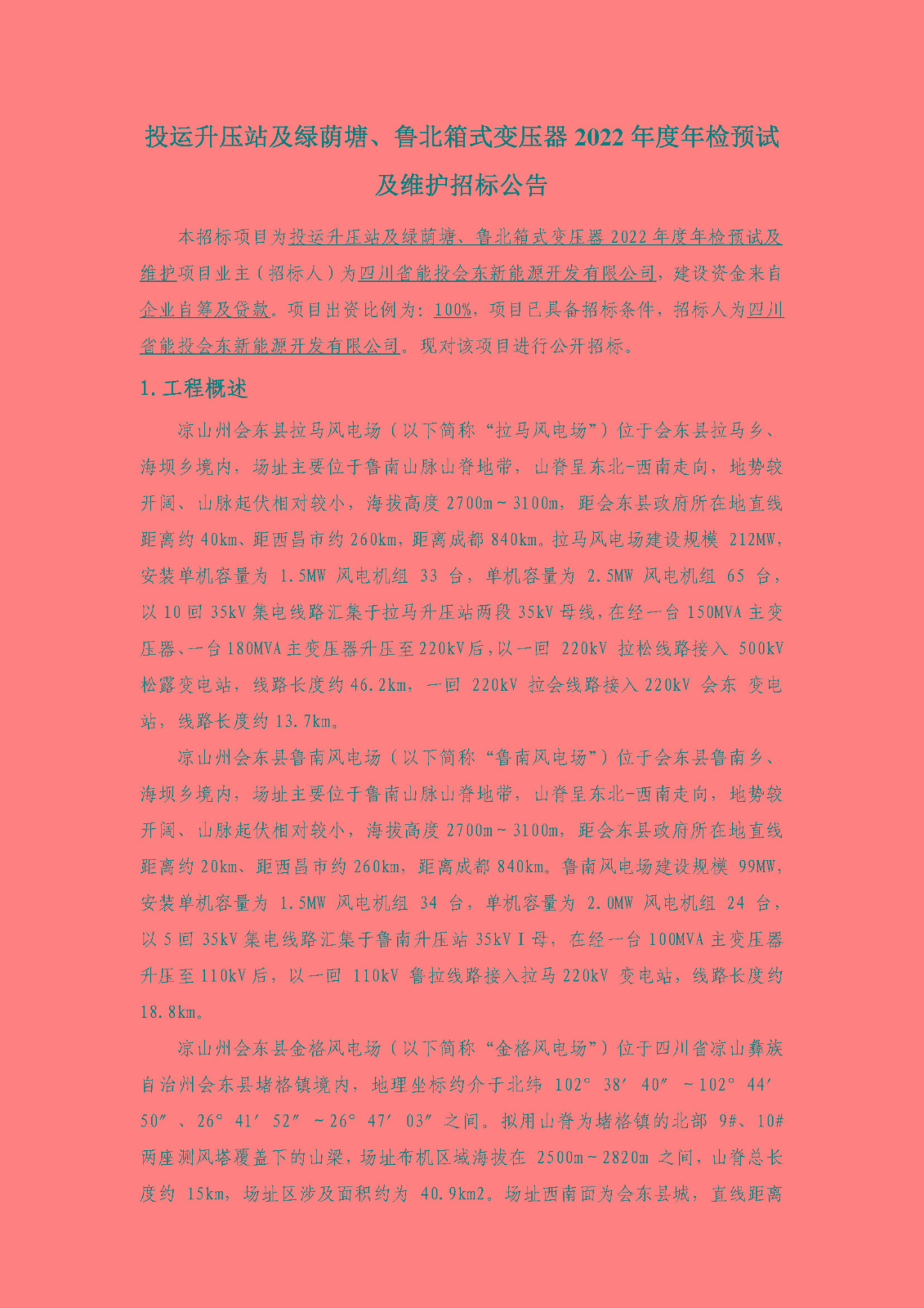 1、投运升压站2022年度年检预试及消缺,主要工作内容:会东拉马风电场升压站设备(主要包括:220kV设备、110kV设备、35kV设备、SVG设备、升压站二次设备等)的现场年检预试、消缺、维护等;会东鲁南风电场升压站设备(主要包括: 110kV设备、35kV设备、升压站二次设备等)的现场年检预试、消缺、维护等;会东金格风电场升压站设备(主要包括:220kV设备、35kV设备、SVG设备、升压站二次设备等)的现场年检预试、消缺、维护等。具体内容详见技术要求。