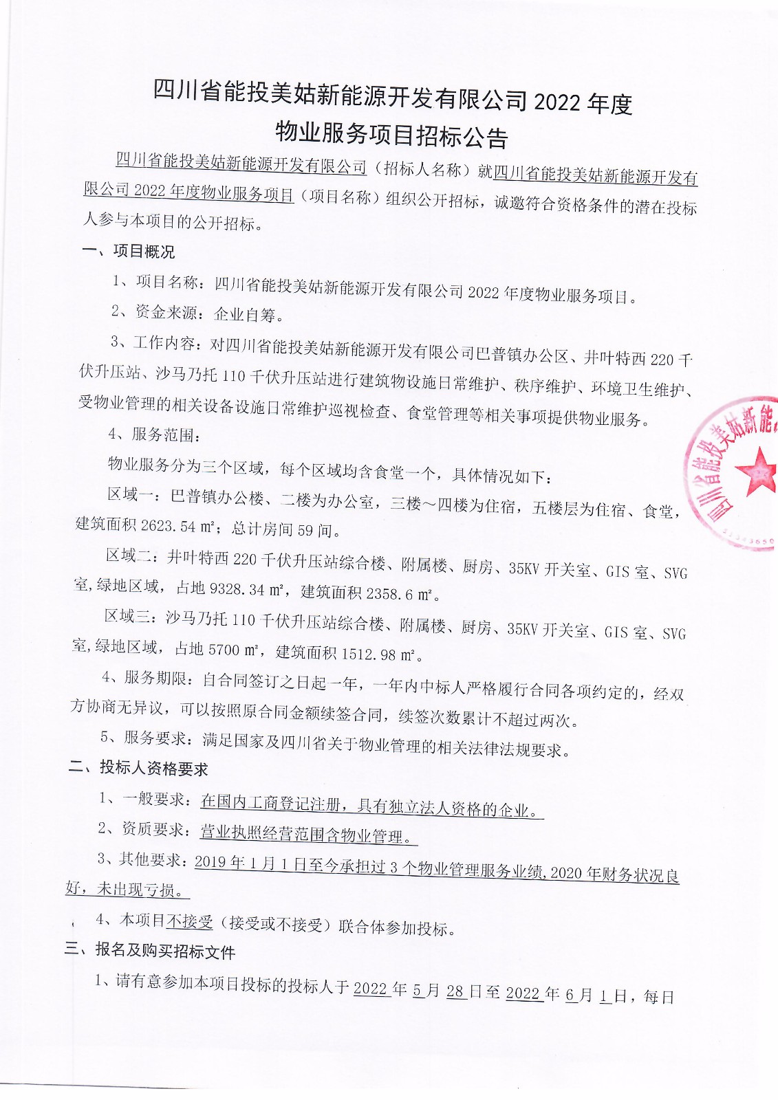 四川省能投美姑新能源开发有限公司(招标人名称)就四川省能投美姑新能源开发有限公司2022年度物业服务项目(项目名称)组织公开招标,诚邀符合资格条件的潜在投标人参与本项目的公开招标。