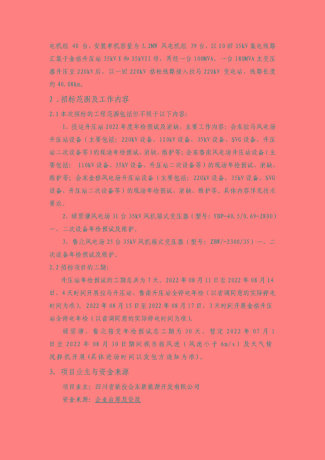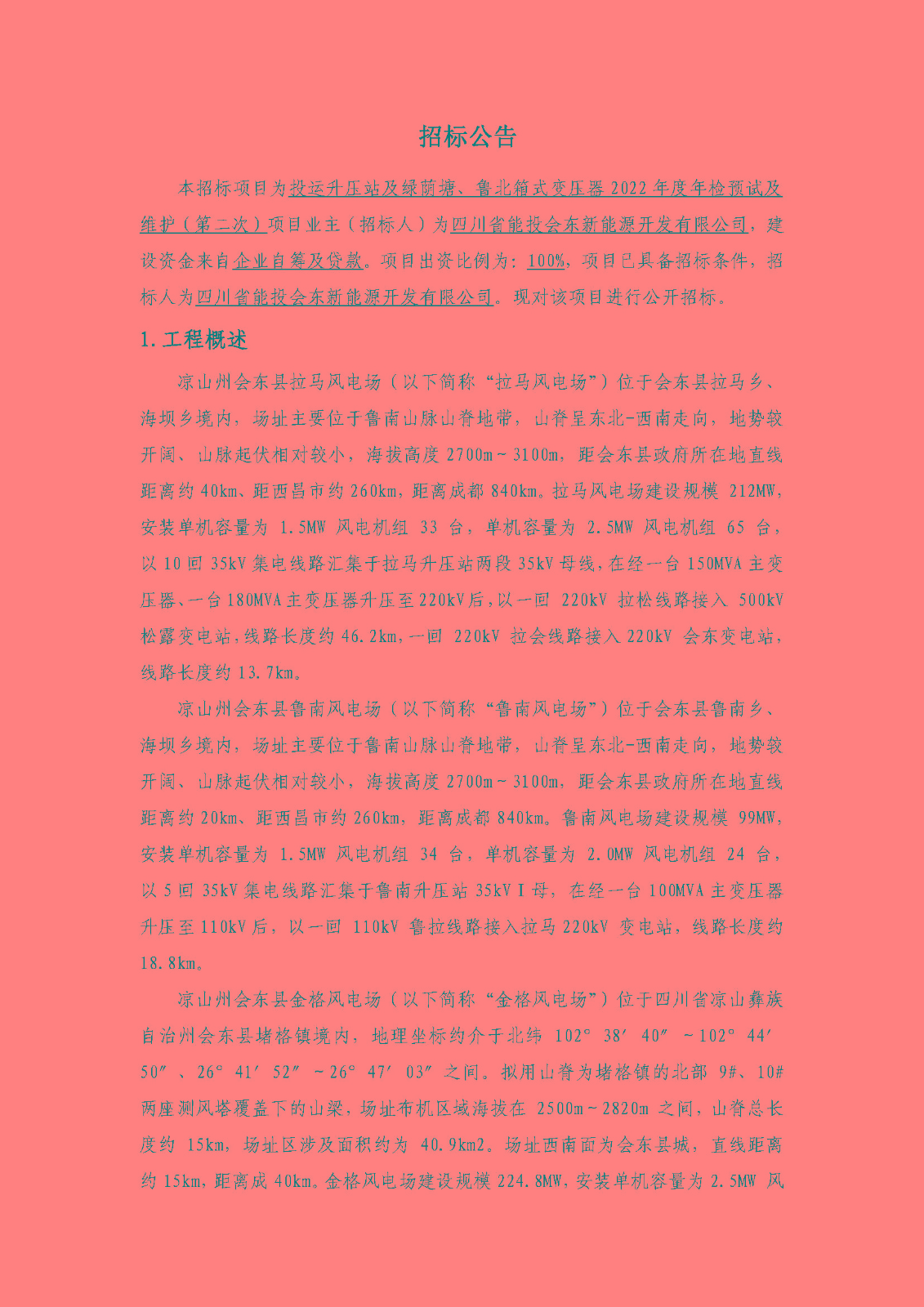 1、投运升压站2022年度年检预试及消缺,主要工作内容:会东拉马风电场升压站设备(主要包括:220kV设备、110kV设备、35kV设备、SVG设备、升压站二次设备等)的现场年检预试、消缺、维护等;会东鲁南风电场升压站设备(主要包括: 110kV设备、35kV设备、升压站二次设备等)的现场年检预试、消缺、维护等;会东金格风电场升压站设备(主要包括:220kV设备、35kV设备、SVG设备、升压站二次设备等)的现场年检预试、消缺、维护等。具体内容详见技术要求。