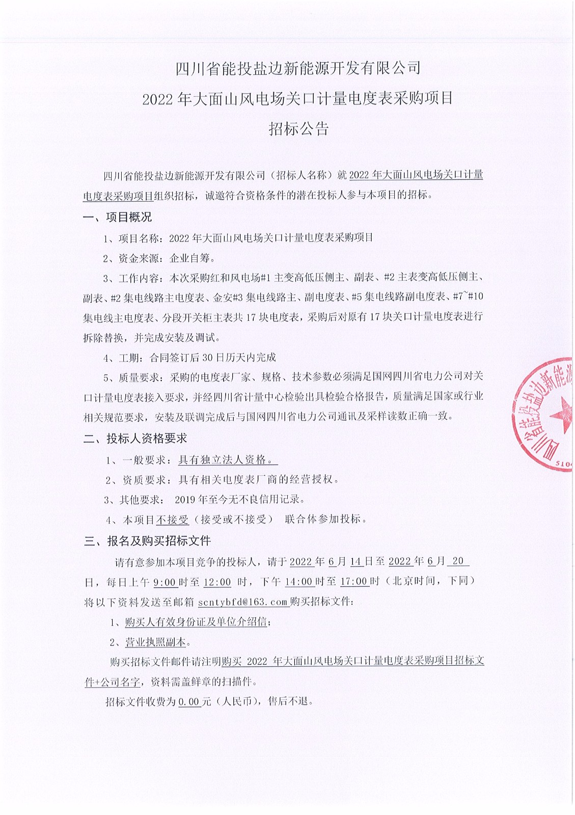 四川省能投盐边新能源开发有限公司(招标人名称)就2022年大面山风电场关口计量电度表采购项目组织招标,诚邀符合资格条件的潜在投标人参与本项目的招标。