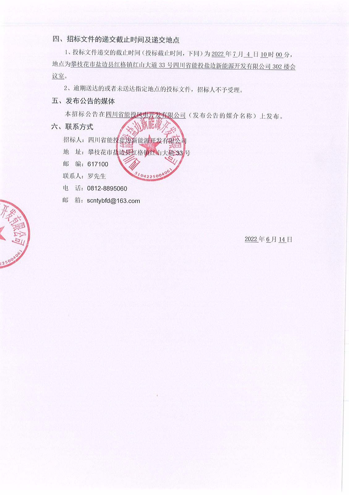 1、投标文件递交的截止时间(投标截止时间,下同)为2022年7月 4 日10时00分,地点为攀枝花市盐边县红格镇红山大道33号四川省能投盐边新能源开发有限公司302楼会议室。