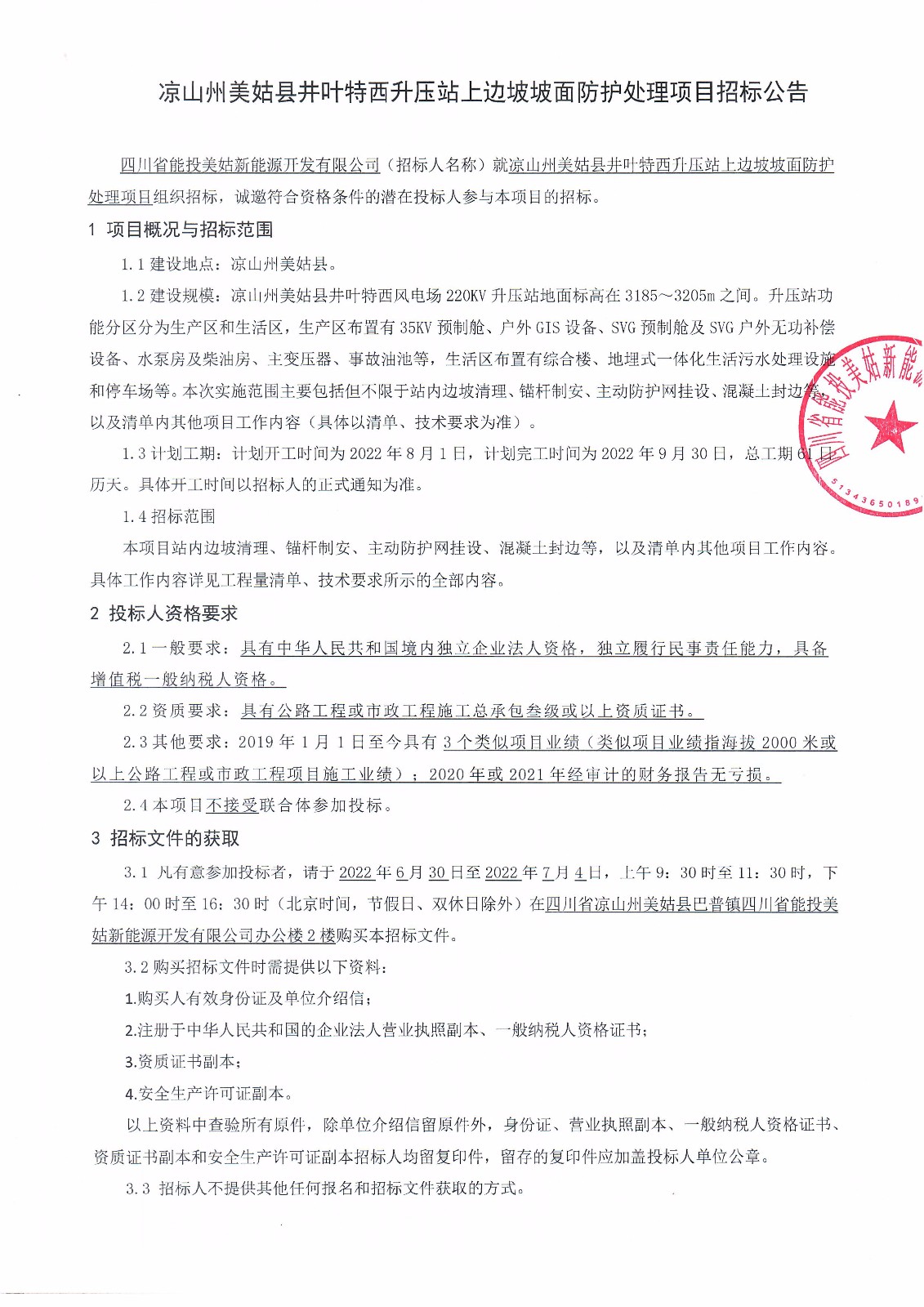 四川省能投美姑新能源开发有限公司(招标人名称)就凉山州美姑县井叶特西升压站上边坡坡面防护处理项目组织招标,诚邀符合资格条件的潜在投标人参与本项目的招标。