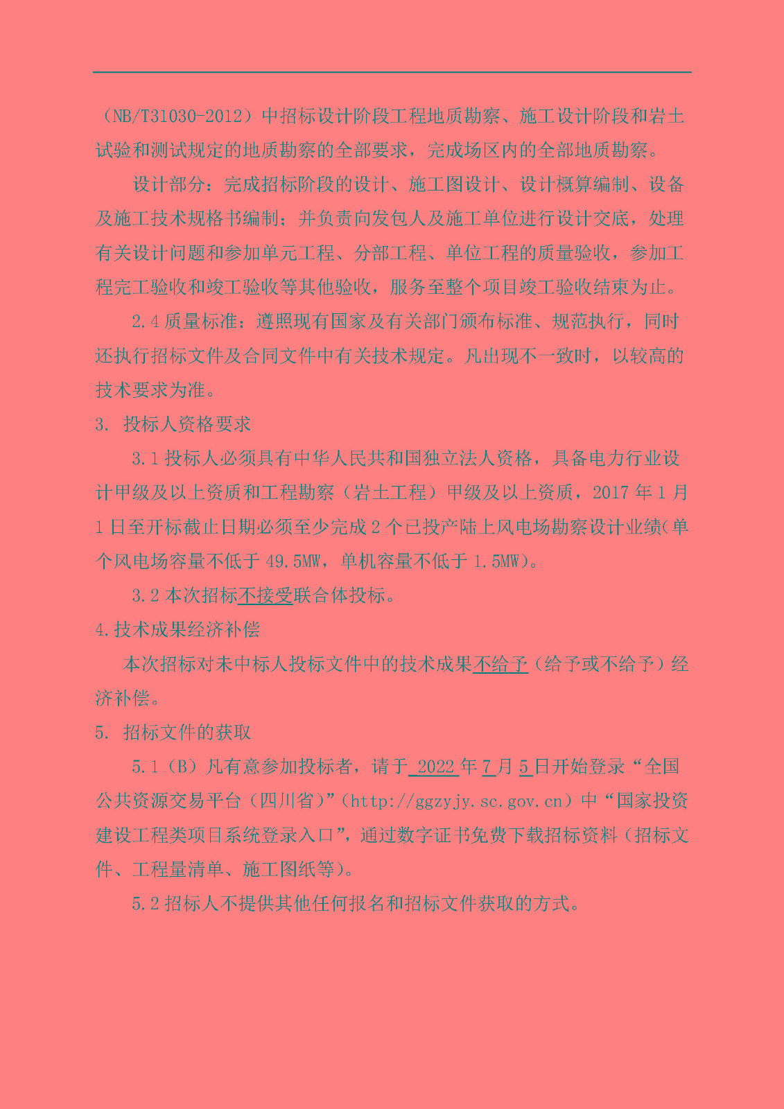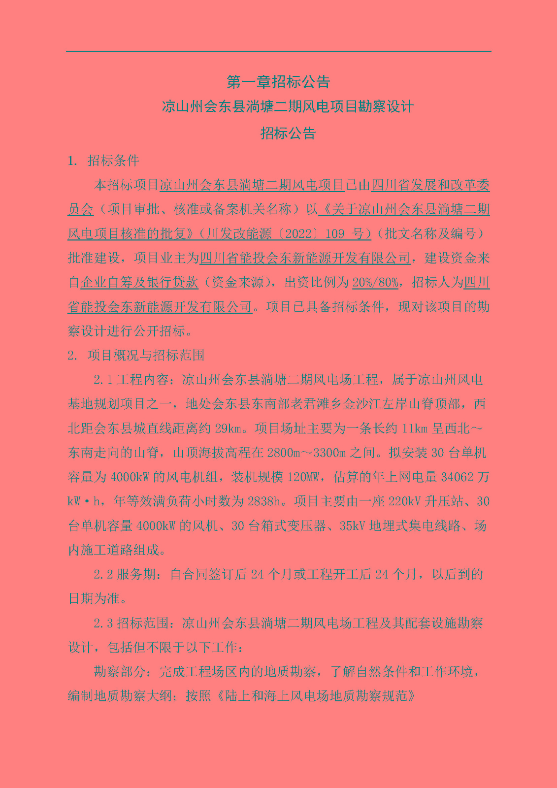 2.3招标范围:凉山州会东县淌塘二期风电场工程及其配套设施勘察设计,包括但不限于以下工作: