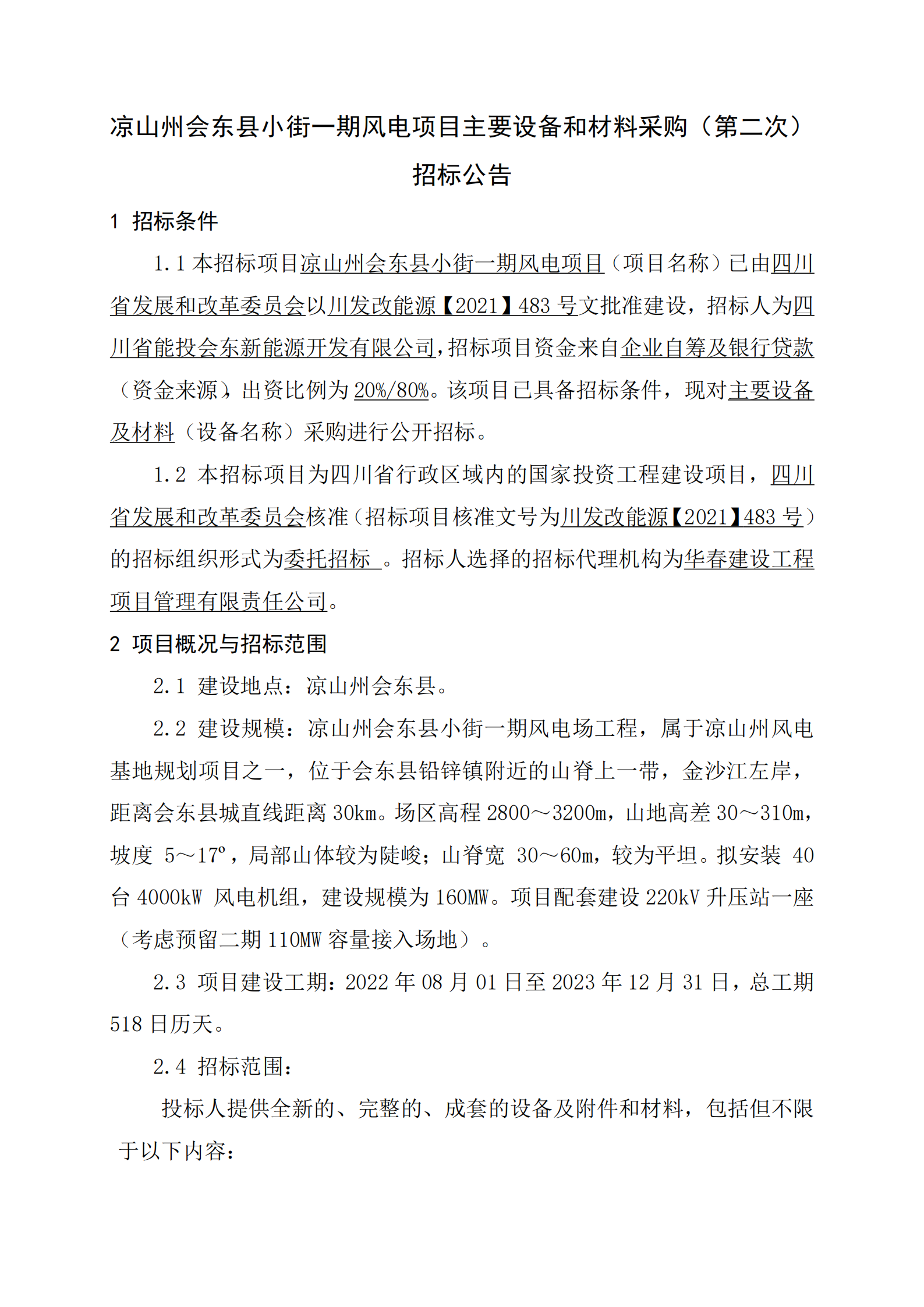 1.1本招标项目凉山州会东县小街一期风电项目(项目名称)已由四川省发展和改革委员会以川发改能源【2021】483号文批准建设,招标人为四川省能投会东新能源开发有限公司,招标项目资金来自企业自筹及银行贷款(资金来源),出资比例为20%/80%。该项目已具备招标条件,现对主要设备及材料(设备名称)采购进行公开招标。