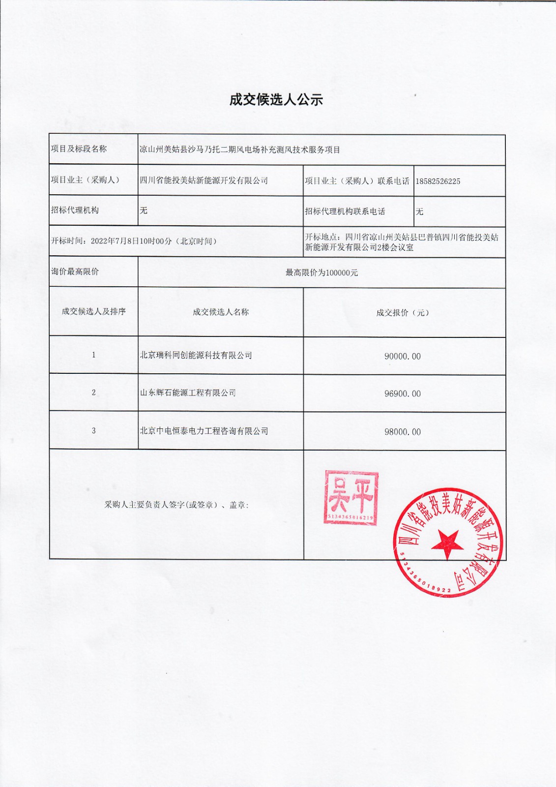 凉山州美姑县沙马乃托二期风电场补充测风技术服务项目成交候选人公示