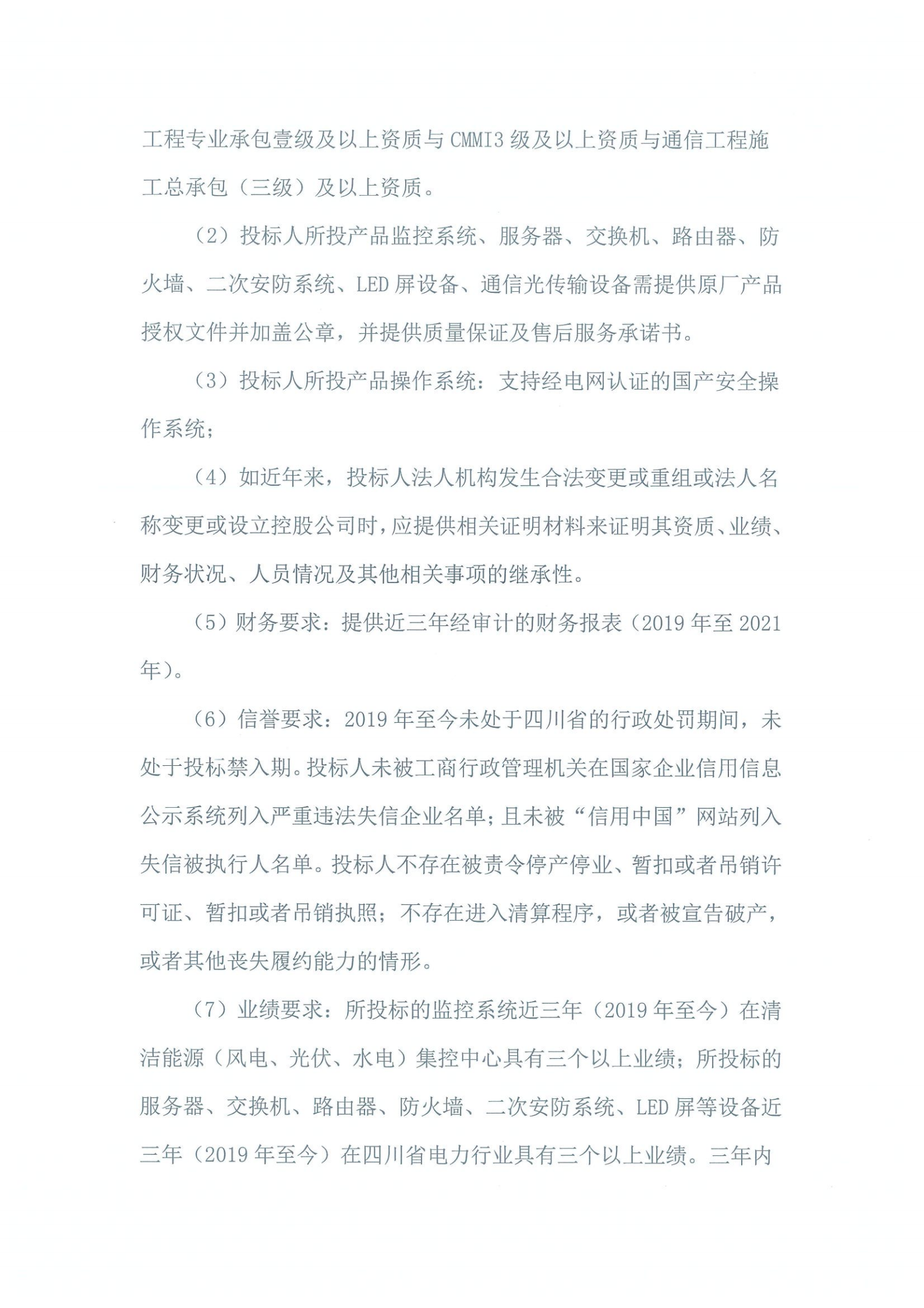 (7)业绩要求:所投标的监控系统近三年(2019年至今)在清洁能源(风电、光伏、水电)集控中心具有三个以上业绩;所投标的服务器、交换机、路由器、防火墙、二次安防系统、LED屏等设备近三年(2019年至今)在四川省电力行业具有三个以上业绩。三年内无行业内不良记录,提供合同或协议(包含封面页、工程量清单或内容明细页、合同签署页)等证明材料复印件。