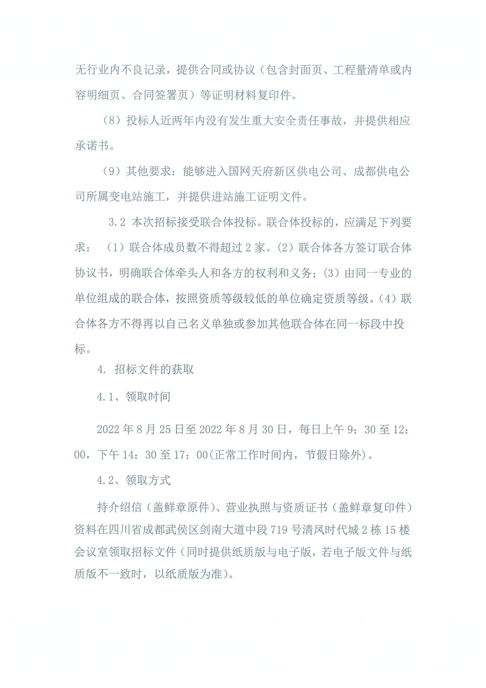 (9)其他要求:能够进入国网天府新区供电公司、成都供电公司所属变电站施工,并提供进站施工证明文件。