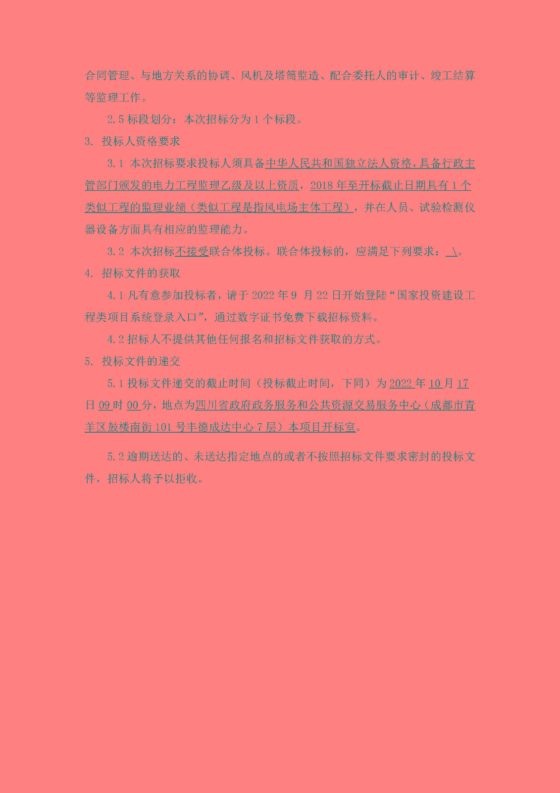 3.1 本次招标要求投标人须具备中华人民共和国独立法人资格,具备行政主管部门颁发的电力工程监理乙级及以上资质,2018年至开标截止日期具有1个类似工程的监理业绩(类似工程是指风电场主体工程),并在人员、试验检测仪器设备方面具有相应的监理能力。