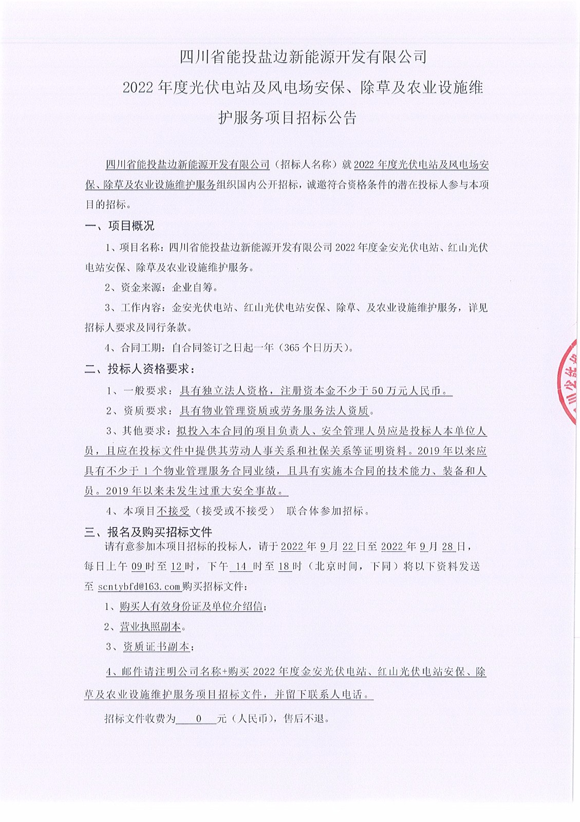 四川省能投盐边新能源开发有限公司(招标人名称)就2022年度光伏电站及风电场安保、除草及农业设施维护服务组织国内公开招标,诚邀符合资格条件的潜在投标人参与本项目的招标。