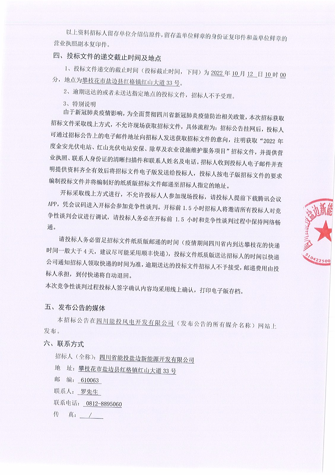1、项目名称:四川省能投盐边新能源开发有限公司2022年度金安光伏电站、红山光伏电站安保、除草及农业设施维护服务。