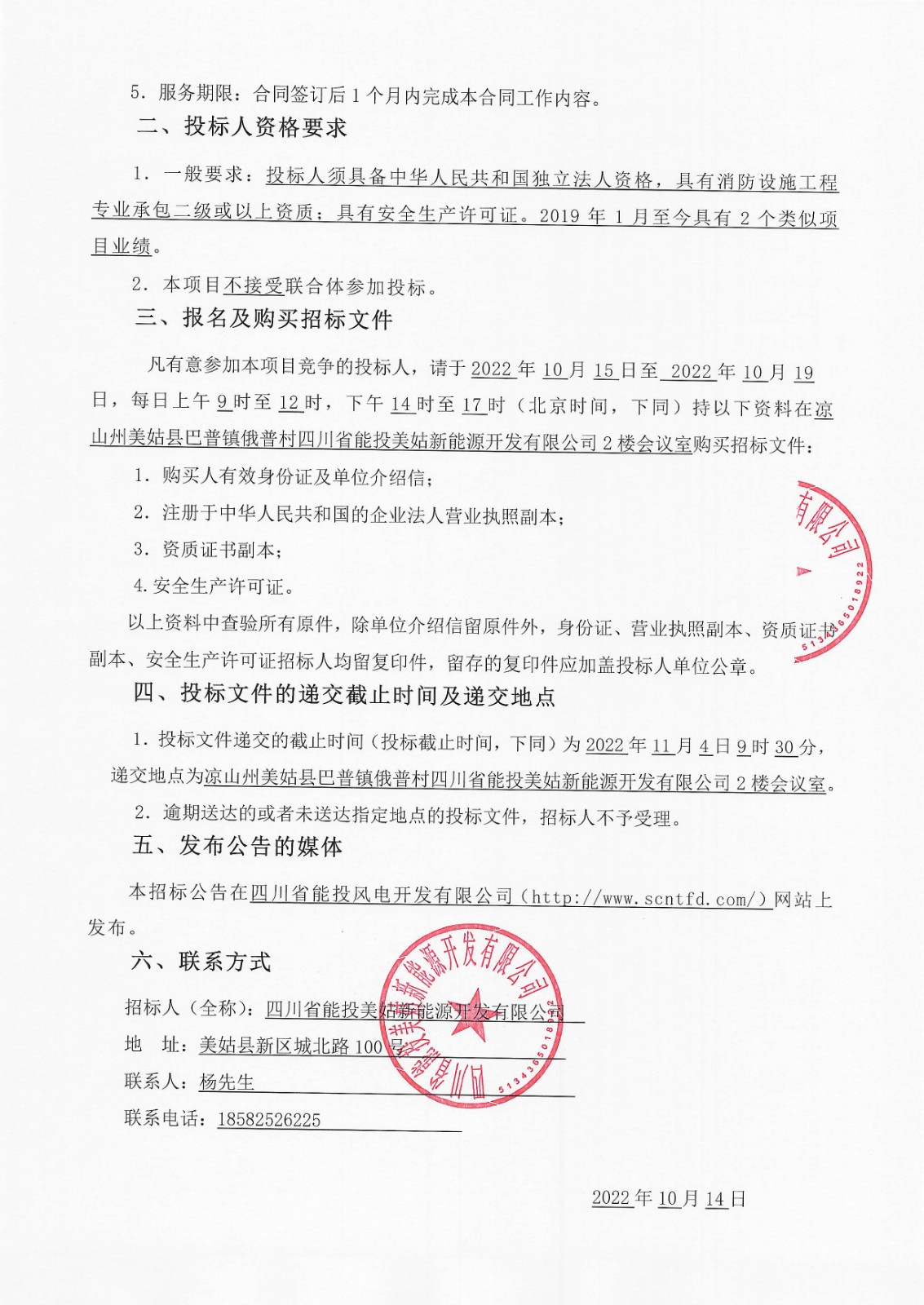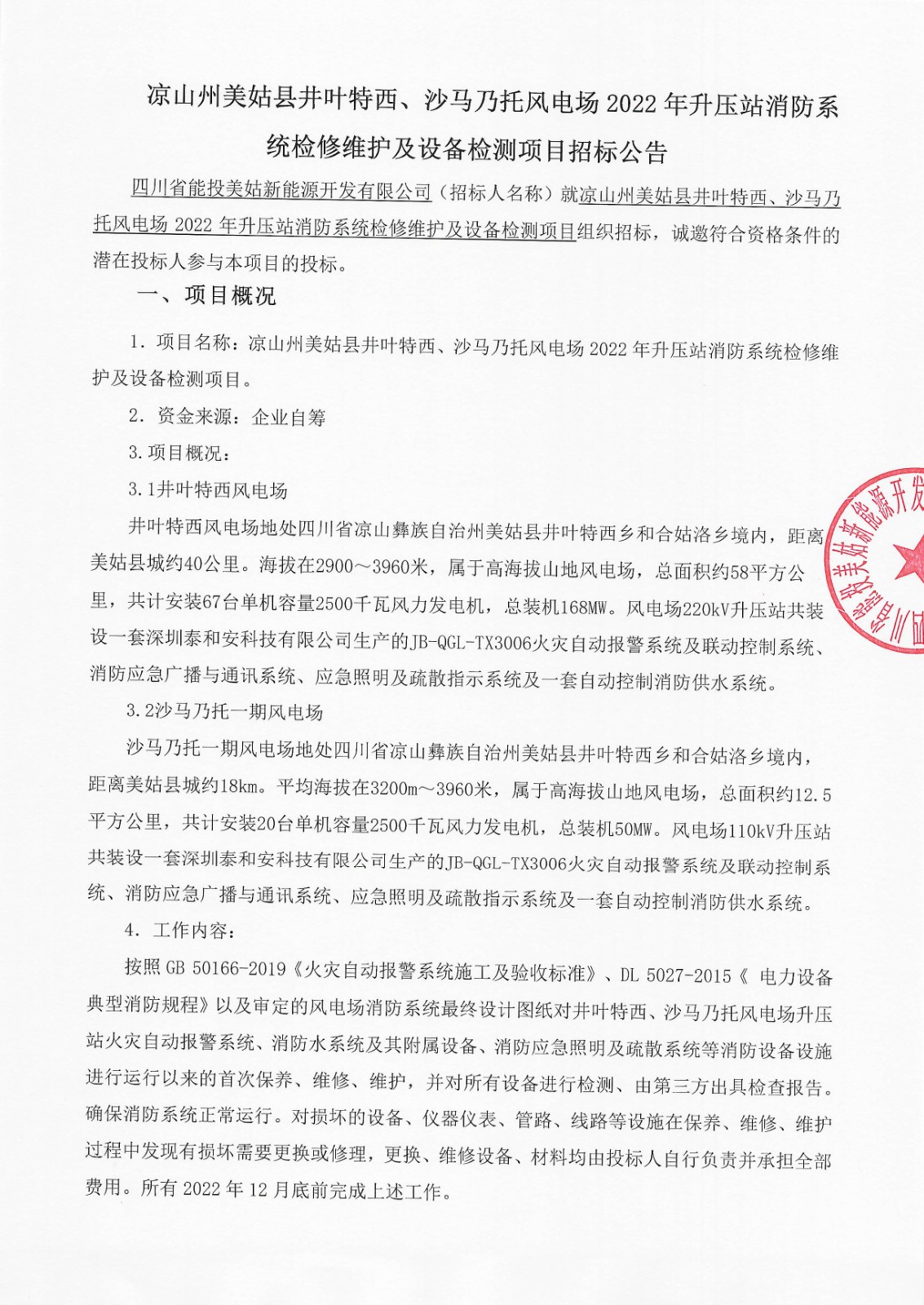 四川省能投美姑新能源开发有限公司(招标人名称)就凉山州美姑县井叶特西、沙马乃托风电场2022年升压站消防系统检修维护及设备检测项目组织招标,诚邀符合资格条件的潜在投标人参与本项目的投标。