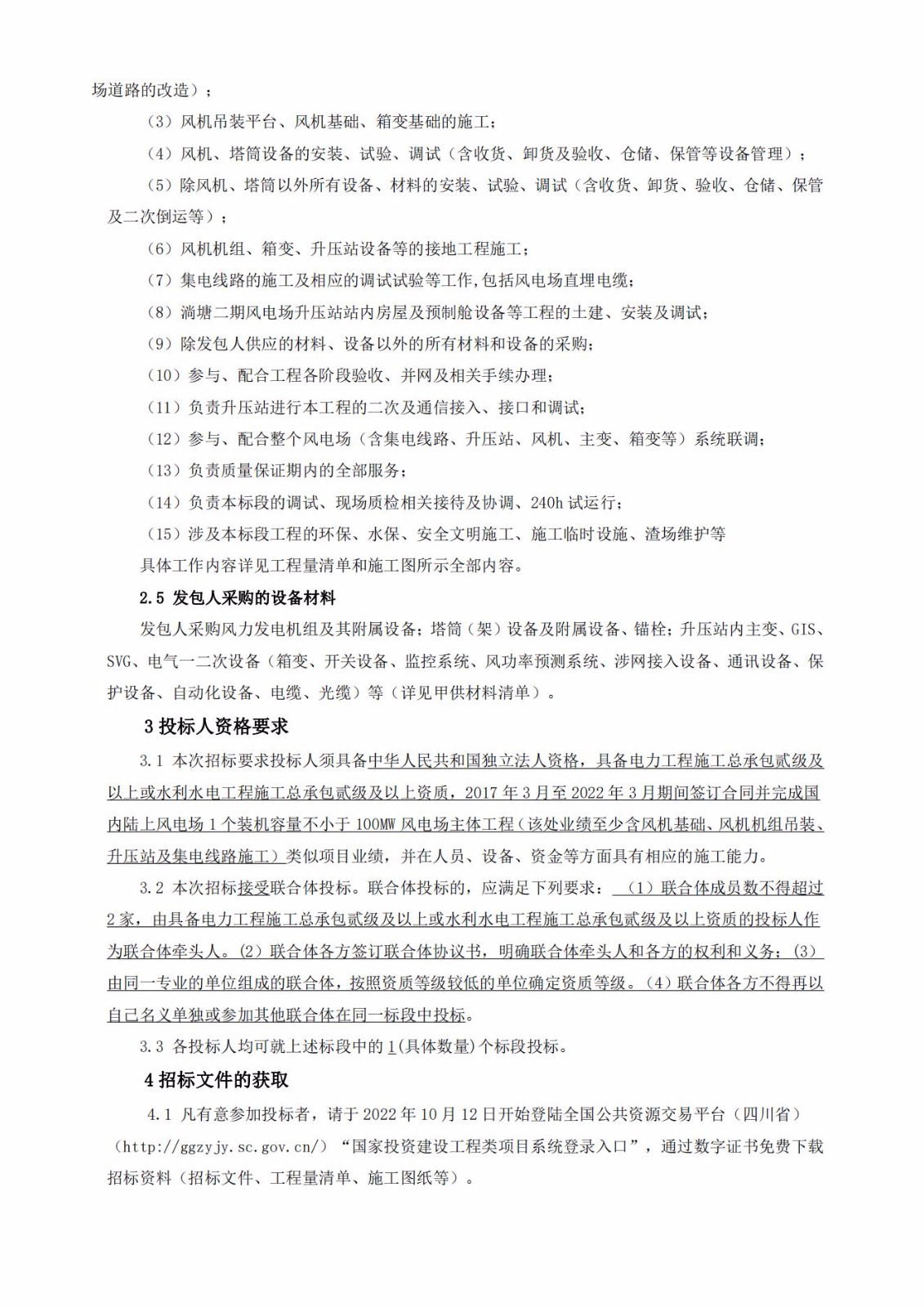 3.1 本次招标要求投标人须具备中华人民共和国独立法人资格,具备电力工程施工总承包贰级及以上或水利水电工程施工总承包贰级及以上资质,2017年3月至2022年3月期间签订合同并完成国内陆上风电场1个装机容量不小于100MW风电场主体工程(该处业绩至少含风机基础、风机机组吊装、升压站及集电线路施工)类似项目业绩,并在人员、设备、资金等方面具有相应的施工能力。