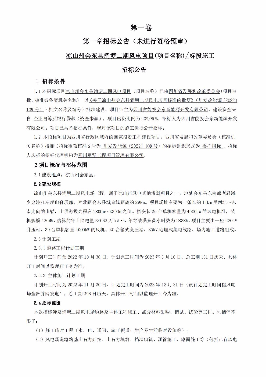 1.1本招标项目凉山州会东县淌塘二期风电项目(项目名称)已由四川省发展和改革委员会(项目审批、核准或备案机关名称) 以《关于凉山州会东县淌塘二期风电项目核准的批复》(川发改能源〔2022〕109号)(批文名称及编号)批准建设,项目业主为四川省能投会东新能源开发有限公司,建设资金来自 企业自筹及银行贷款(资金来源),项目出资比例为20%/80%,招标人为四川省能投会东新能源开发有限公司。项目已具备招标条件,现对该项目的施工进行公开招标。