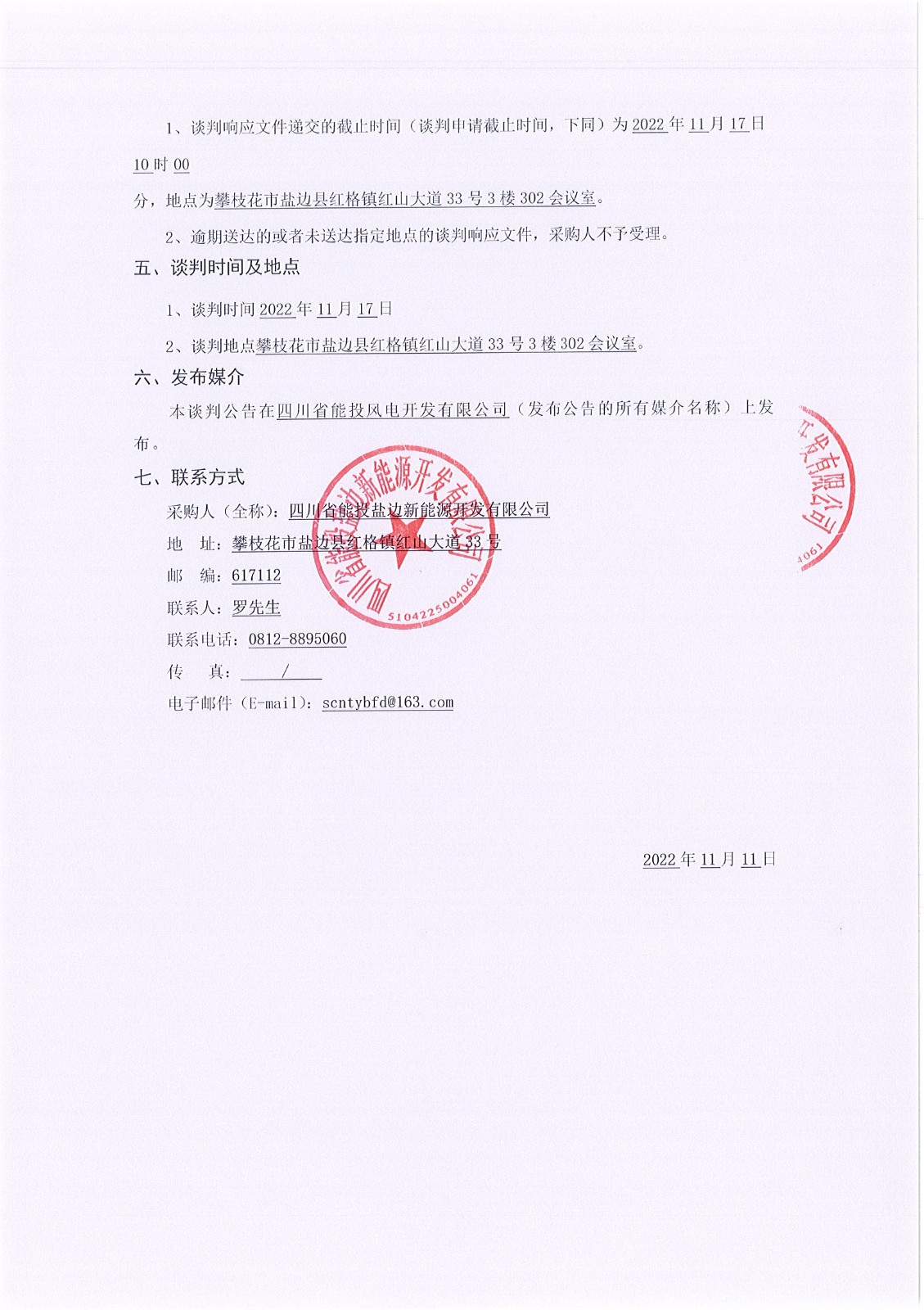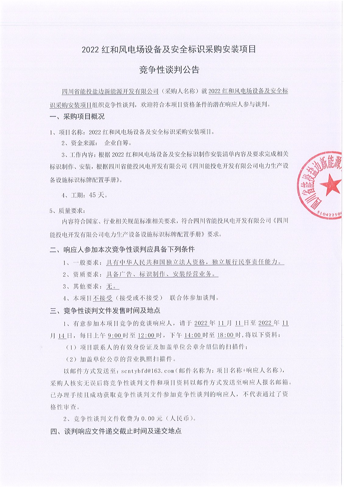 四川省能投盐边新能源开发有限公司(采购人名称)就2022红和风电场设备及安全标识采购安装项目组织竞争性谈判,欢迎符合本项目资格条件的潜在响应人参与谈判。