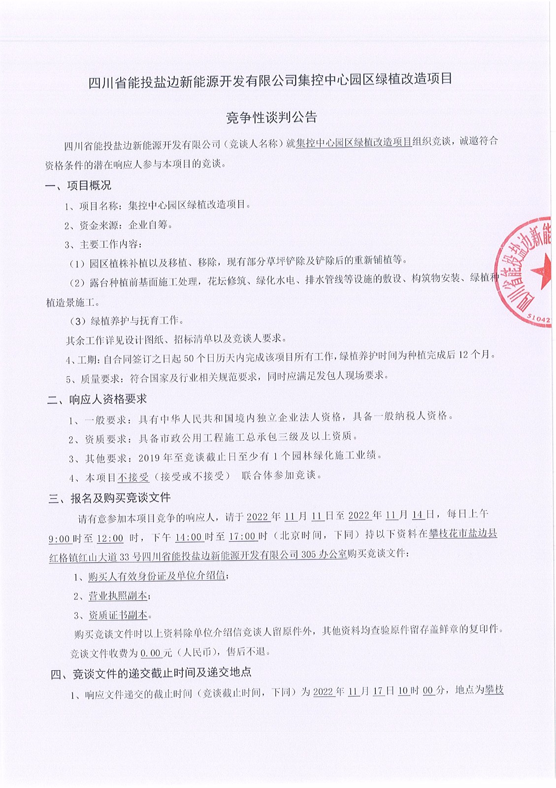 四川省能投盐边新能源开发有限公司(竞谈人名称)就集控中心园区绿植改造项目组织竞谈,诚邀符合资格条件的潜在响应人参与本项目的竞谈。
