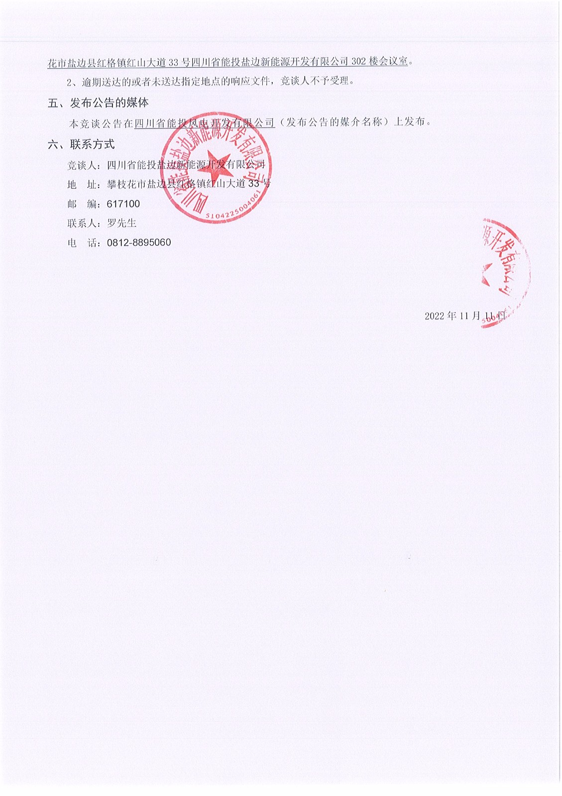 1、响应文件递交的截止时间(竞谈截止时间,下同)为2022年11月17日10时00分,地点为攀枝花市盐边县红格镇红山大道33号四川省能投盐边新能源开发有限公司302楼会议室。