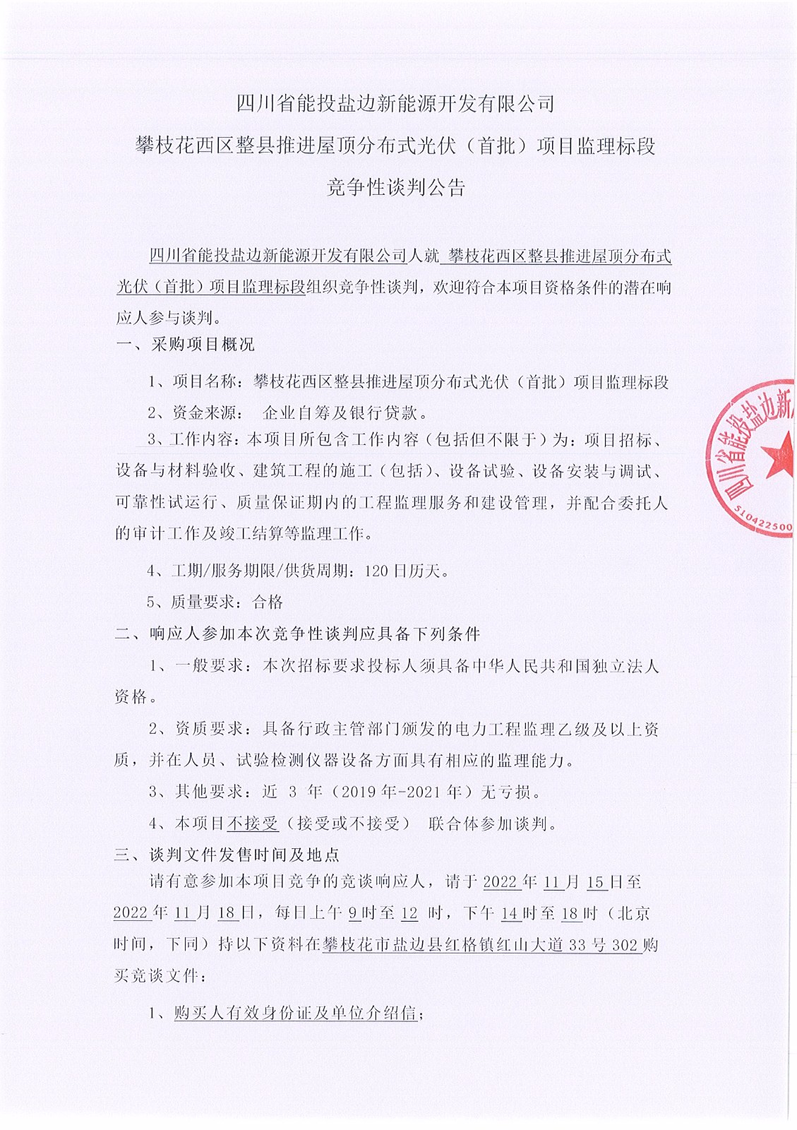 四川省能投盐边新能源开发有限公司人就 攀枝花西区整县推进屋顶分布式光伏(首批)项目监理标段组织竞争性谈判,欢迎符合本项目资格条件的潜在响应人参与谈判。