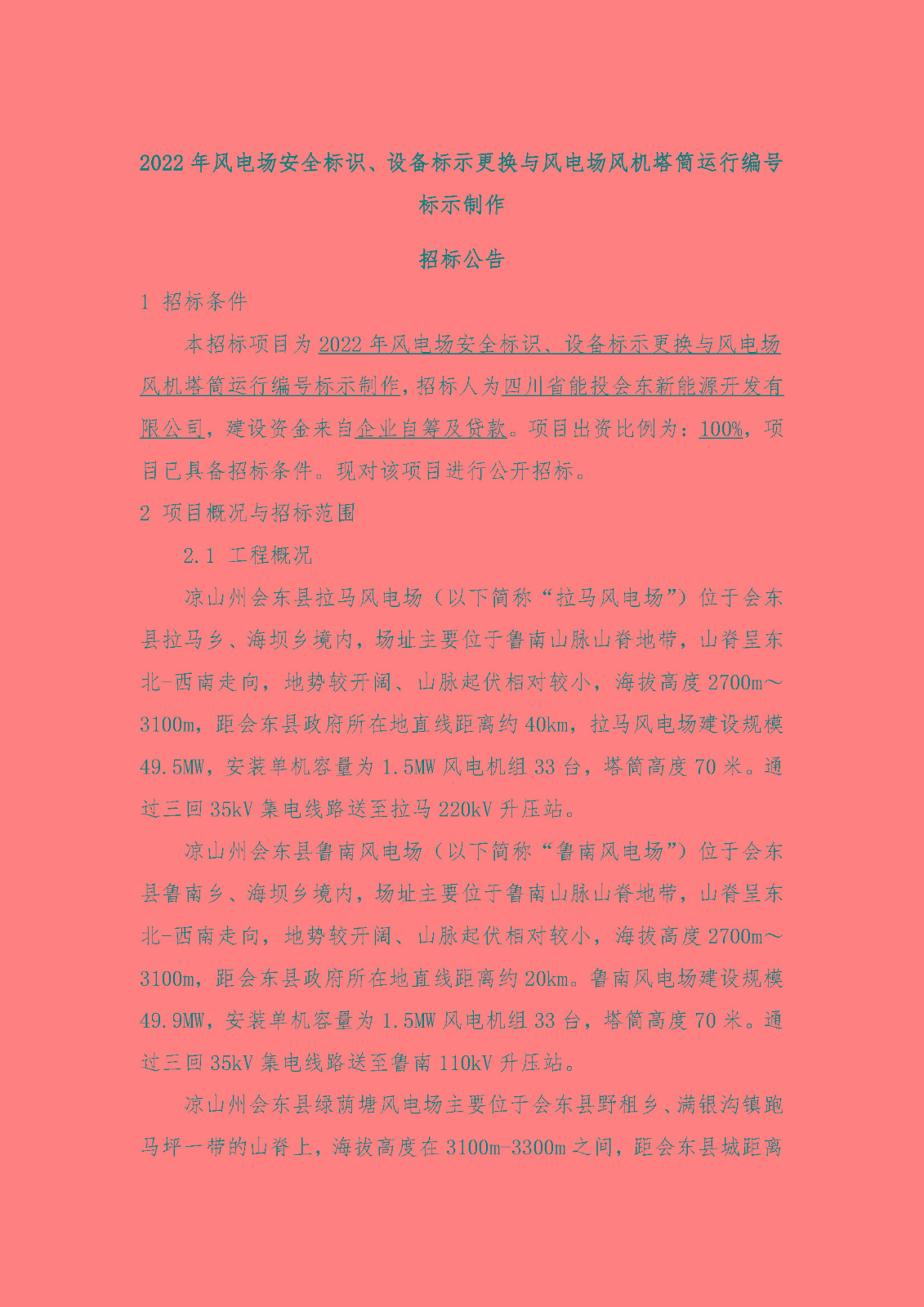 本招标项目为2022年风电场安全标识、设备标示更换与风电场风机塔筒运行编号标示制作,招标人为四川省能投会东新能源开发有限公司,建设资金来自企业自筹及贷款。项目出资比例为:100%,项目已具备招标条件。现对该项目进行公开招标。