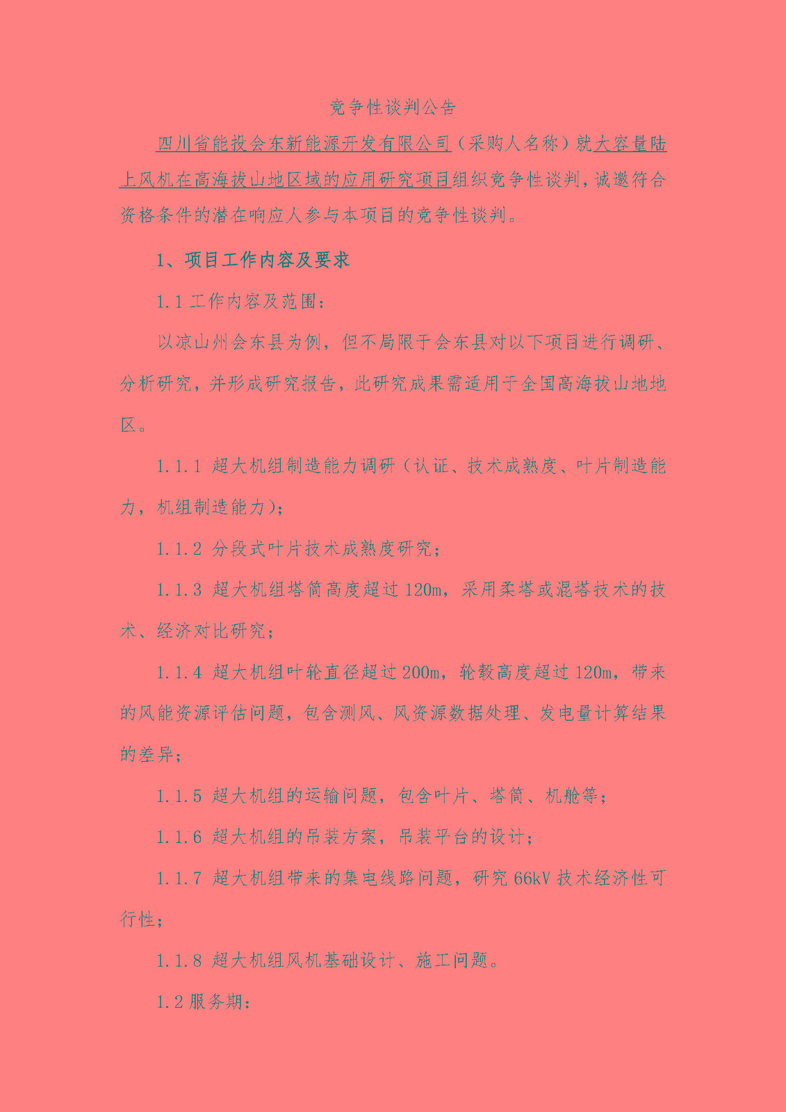 四川省能投会东新能源开发有限公司(采购人名称)就大容量陆上风机在高海拔山地区域的应用研究项目组织竞争性谈判,诚邀符合资格条件的潜在响应人参与本项目的竞争性谈判。