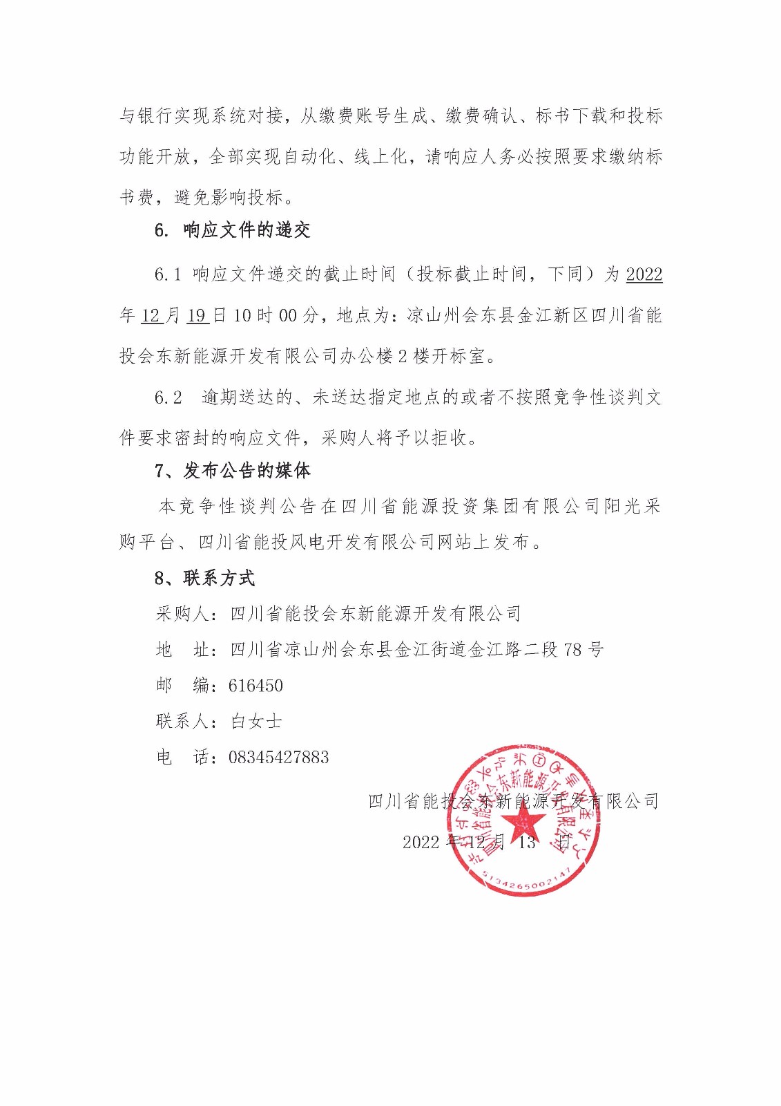 6.1 响应文件递交的截止时间(投标截止时间,下同)为2022年12月19日10时00分,地点为:凉山州会东县金江新区四川省能投会东新能源开发有限公司办公楼2楼开标室。