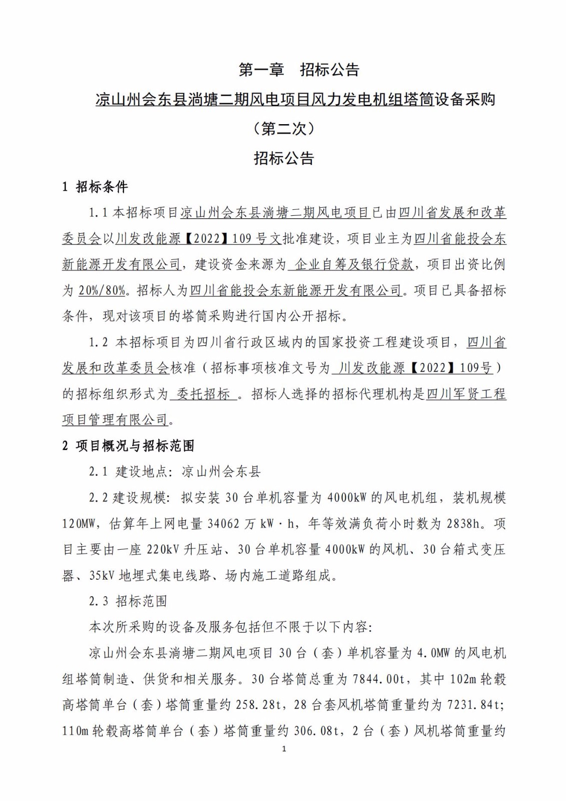 1.1本招标项目凉山州会东县淌塘二期风电项目已由四川省发展和改革委员会以川发改能源【2022】109号文批准建设,项目业主为四川省能投会东新能源开发有限公司,建设资金来源为 企业自筹及银行贷款,项目出资比例为20%/80%。招标人为四川省能投会东新能源开发有限公司。项目已具备招标条件,现对该项目的塔筒采购进行国内公开招标。
